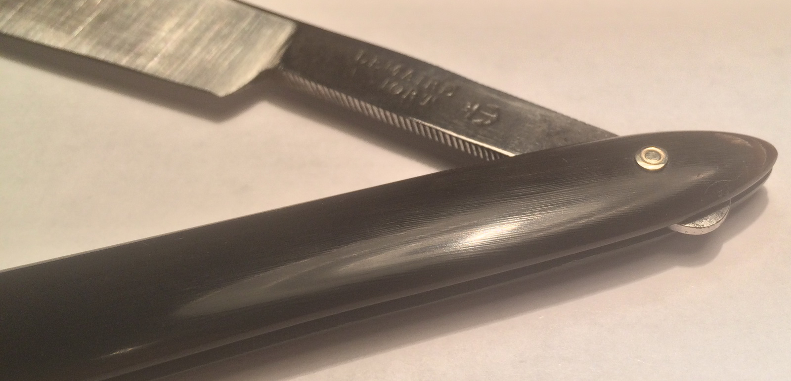 Название списать трудно ибо с французским не дружу. Так что Le MAIRE LE MATRE LEMAIRE LEMATRE В общем как то так Возраст бритвы лет 150 или 160 (мне так кажется Бритва отрегриндена. Ручка сделана из рога и полностью повторяет оригинальную ручку которая была в плачевном состоянии. Бритва заточена с одним слоем изоленты (так как у пяточки слишком узко и если точить без изоленты то там еще сузится а нам этого не надо) Ширина в самой широкой части 19 мм. Клинышек олово. Пины золинген Гринд грубоватый оставлен намеренно ибо 150-200 лет назад зеркало на такой переменной геометрии вряд ли было (зы немножко попортил гринд во время заточки - при заточке на 1000 ке протер воду вдоль полотна и оставил царапки, не кретично но предупредить должен) В общем красота. Цена 10,000 рублей