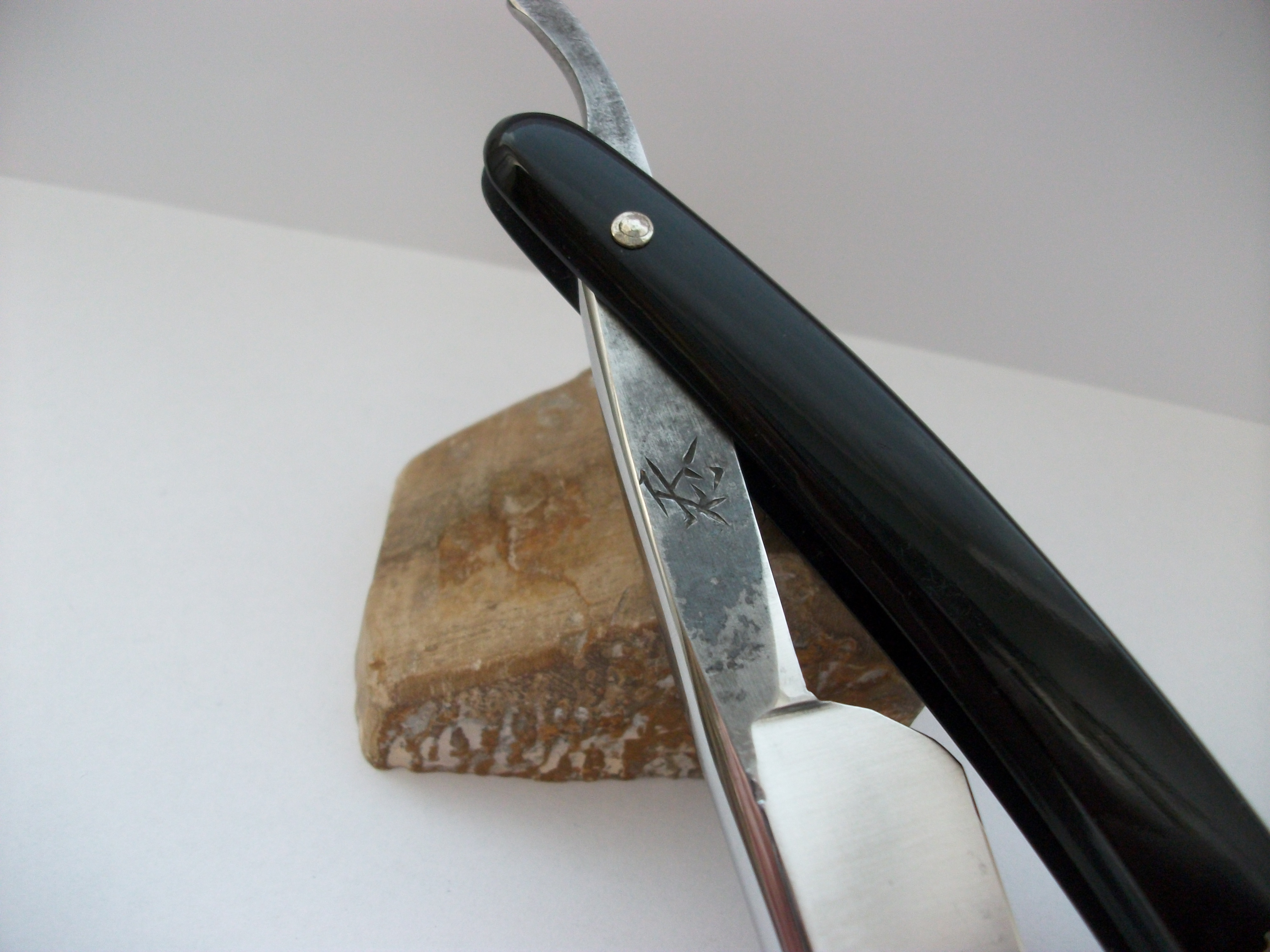 Углеродистая сталь, ширина полотна 15мм, длина режущей кромки примерно 70мм. Полотно в хорошем состоянии - родной сатин и травление. Сталь в работе очень понравилась. Ручка пластик. Заточена и готова к бритью. Продано Spoiler Show