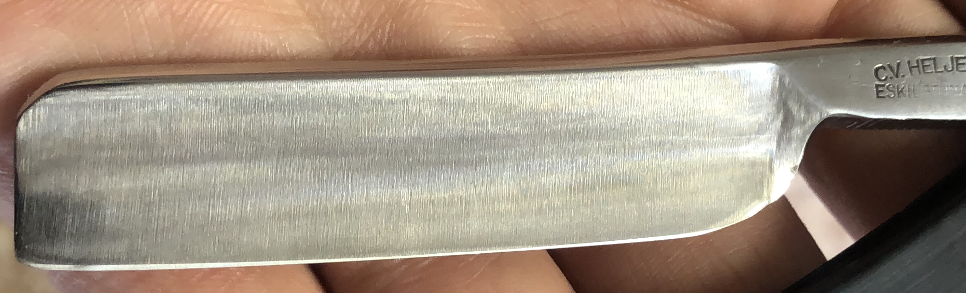 Изначально клинок в пользовании не был, но имел скол , примерно в 1-1,5 мм, который был благополучно сведен на нет.Заодно и немного освежил металл от древней патины,с попыткой повторения"родного"гринда.Сломанная оправа была поменяна на Стизовский донор, того же периода..Идеальная геометрия полотна:кромочка равномерна по всей длине.Заточена и готова к бритью.