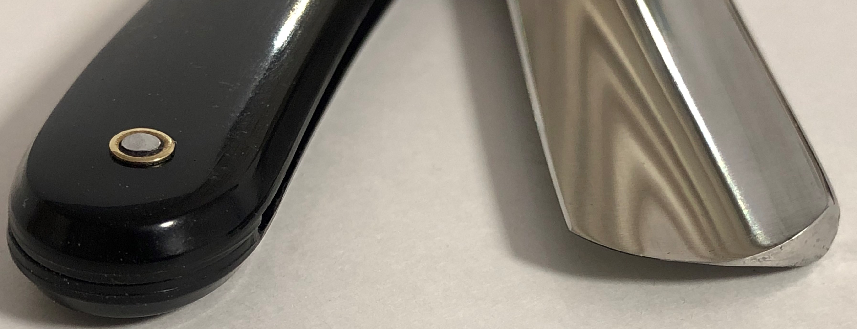 Идеальная геометрия клинка:кромочка равномерна по всей длине и практически незаметна.Редкая, породистая бритва на все времена...Заточена и готова к бритью.