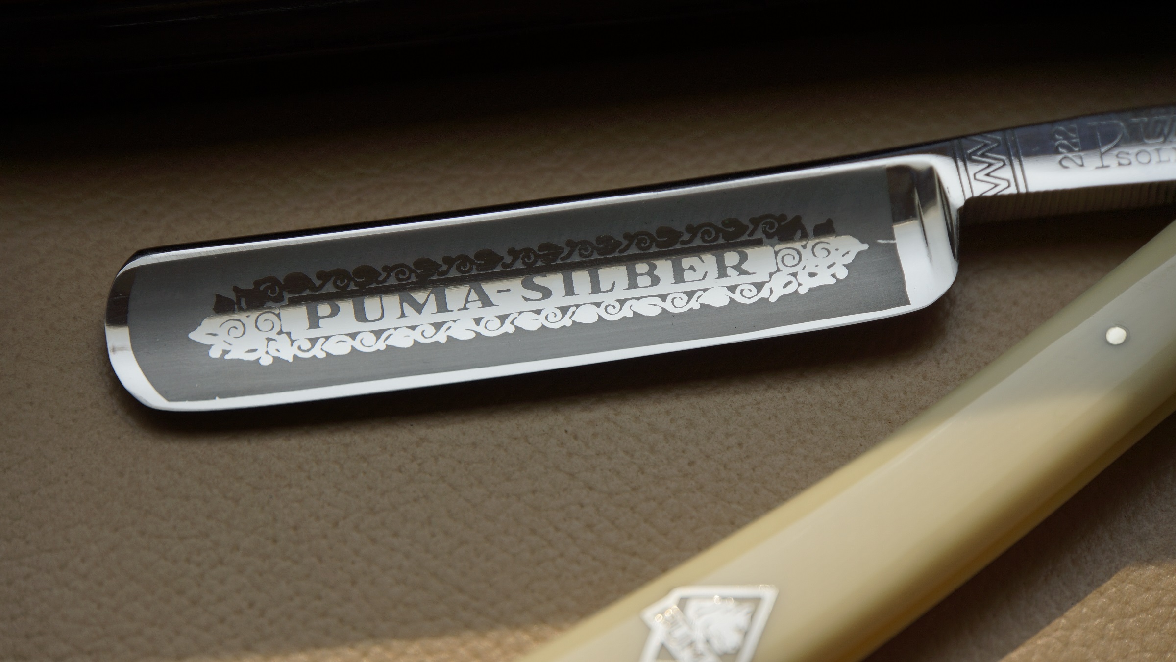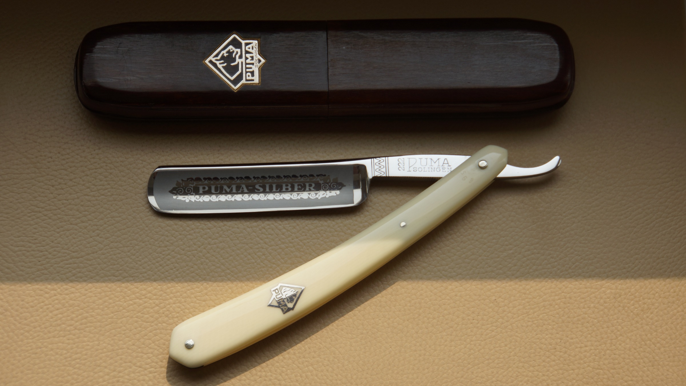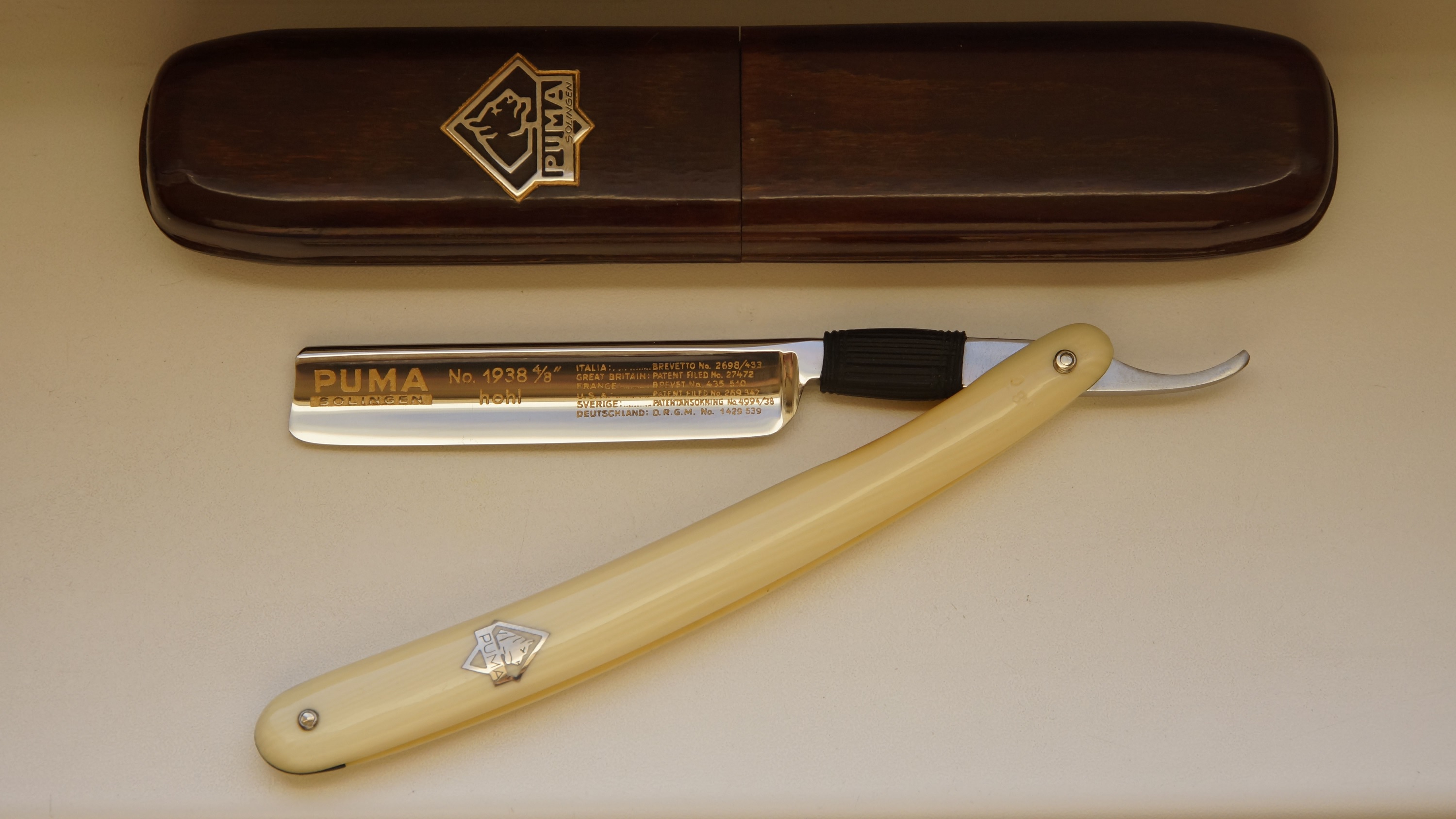 Производитель: Lauterjung & Sohn, Puma-Stahlwaren Германия, г. Золинген Ручка из целлулоида, с металлическим логотипом. Состояние на фото. Бритва заточена и готова к бритью. В комплекте также родной футляр. ПРОДАНО 10) Puma No. 1938, 5/8 Show
