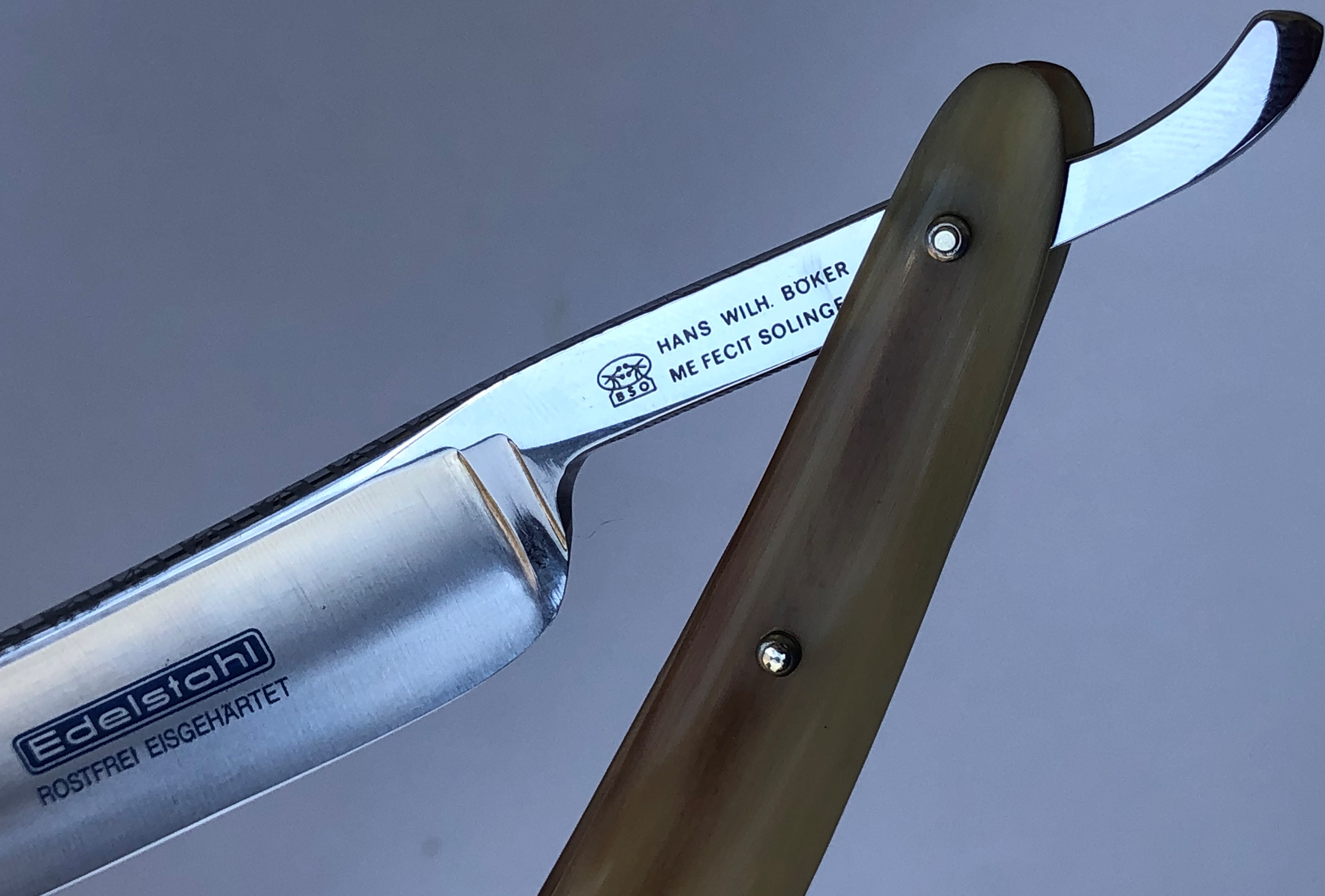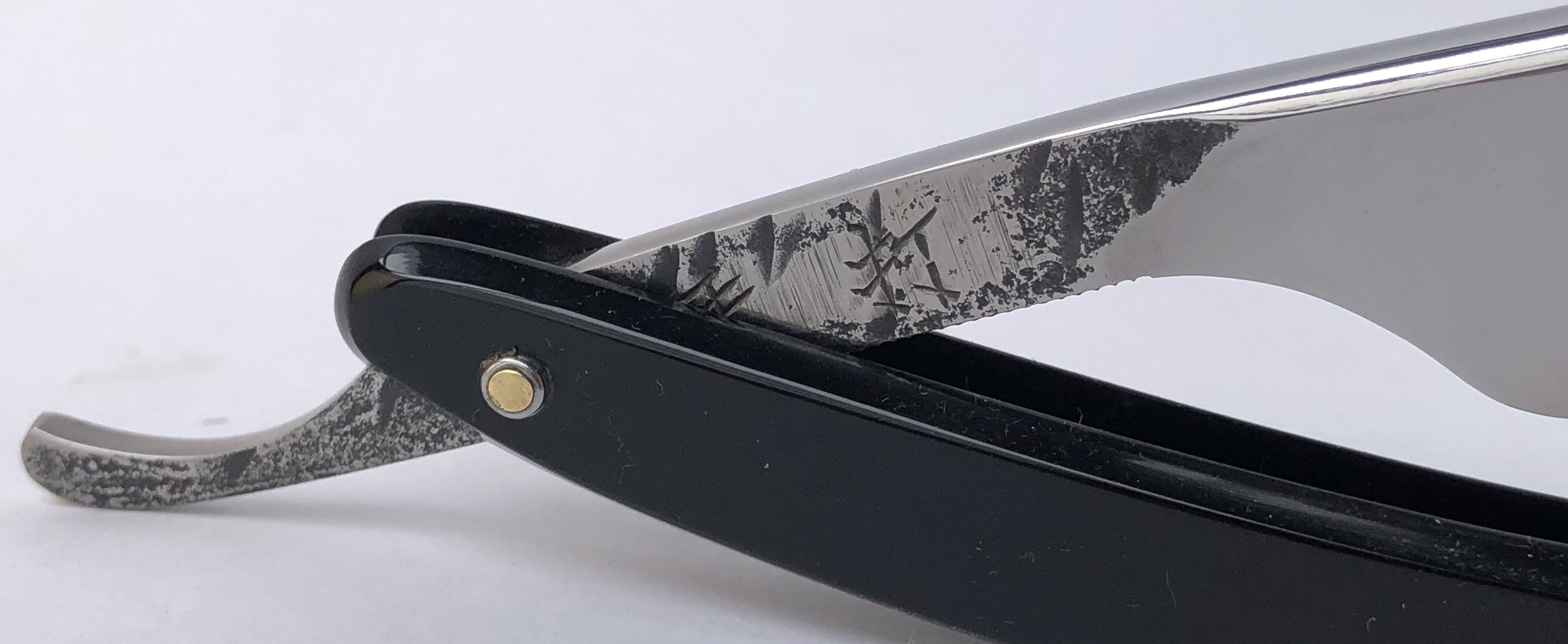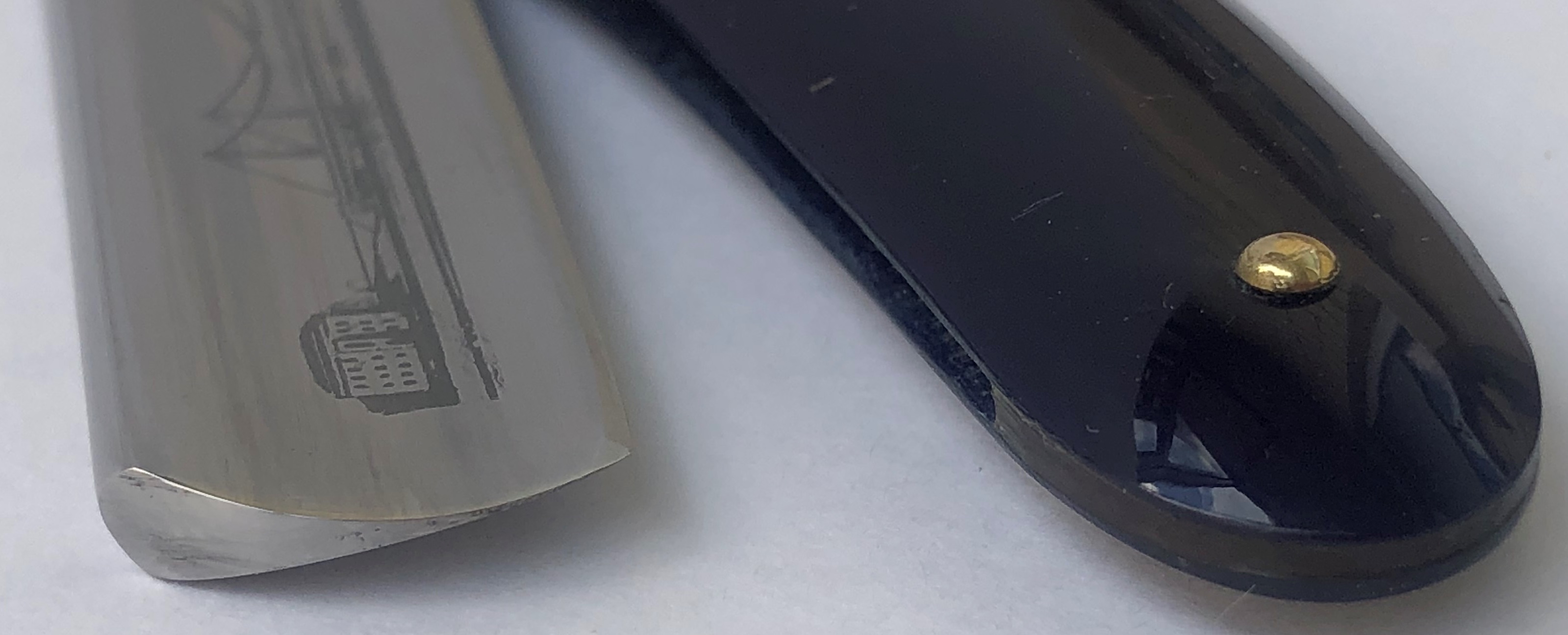 Бритва в идеальном и непользованном состоянии. Ничего не разбиралось и не ремонтировалось.Все как вчера с завода.Оригинальная шлифовка и полировка клинка.Идеальная геометрия полотна:кромочка равномерна по всей длине.Шикарная оправа из натурального рога. Третий средний пин надежно держит оправу от деформации.Ажурный и эффектный обушок.
