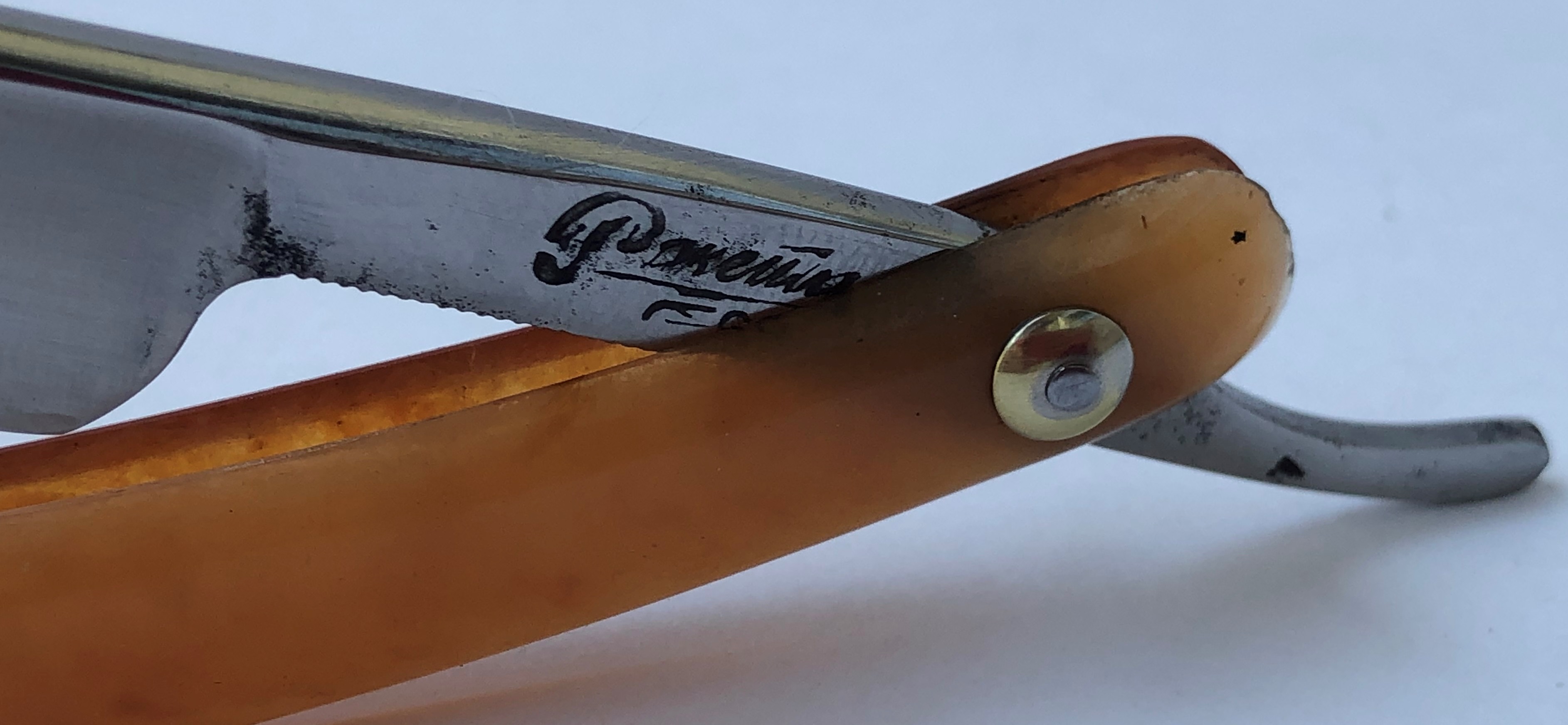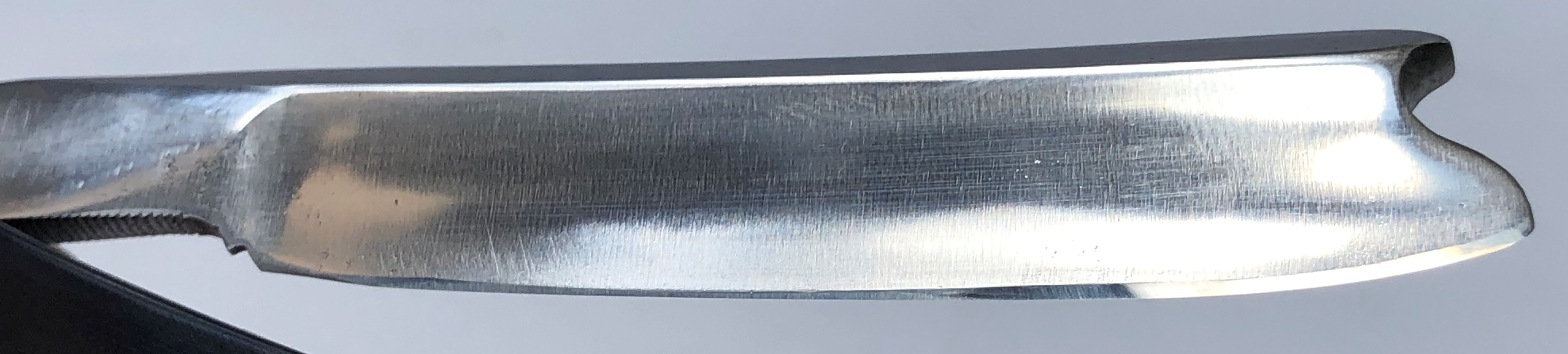 Бритва в очень хорошем состоянии. Реставрация клинка от Frans, новая роговая оправа тоже от него. Мои доработки также присутствуют. Хорошо сохраненная геометрия полотна.Кромочка равномерна по всей длине.Несколько мм у пятки не проточено, чтобы не испортить клинок камнями.Эффектный граненый обушок. В общем и целом красивая французская классика, в отличном и боевом состоянии. Заточена и лично протестирована. Все на очень приличном уровне.