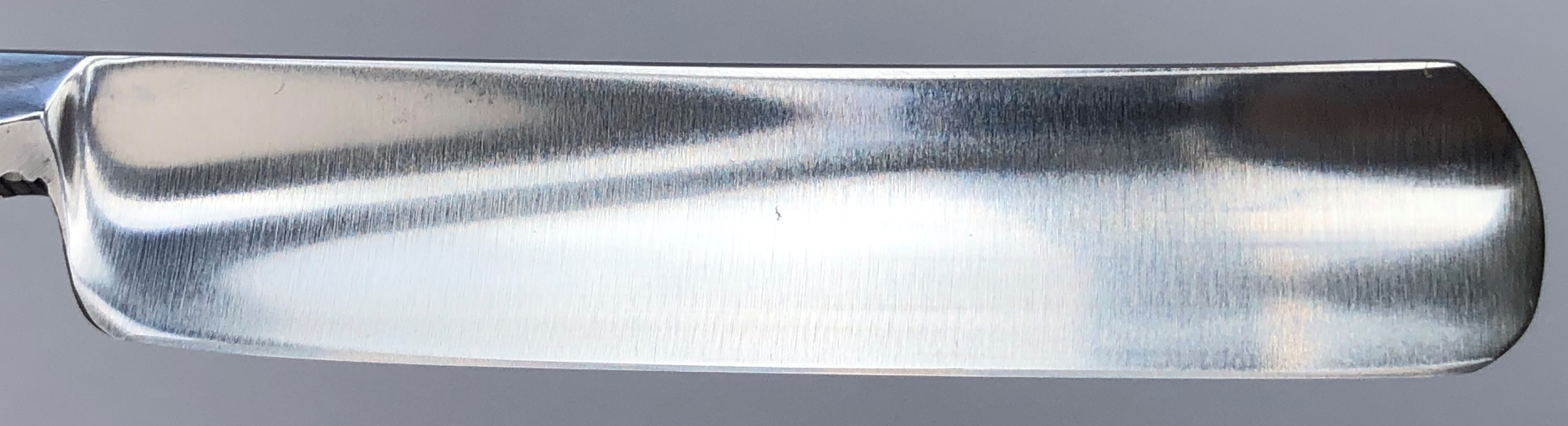 Само полотно на несколько мм укорочено.Было немного освежено от патины, с повторением "родного" характера шлифовки и умеренной полировки.Идеальная геометрия клинка. Сталь чистая, без видимых дефектов.Очень приятная во всех отношениях бритва, достаточно недорогая и если бы не укороченное полотно, то цены бы ей не было...