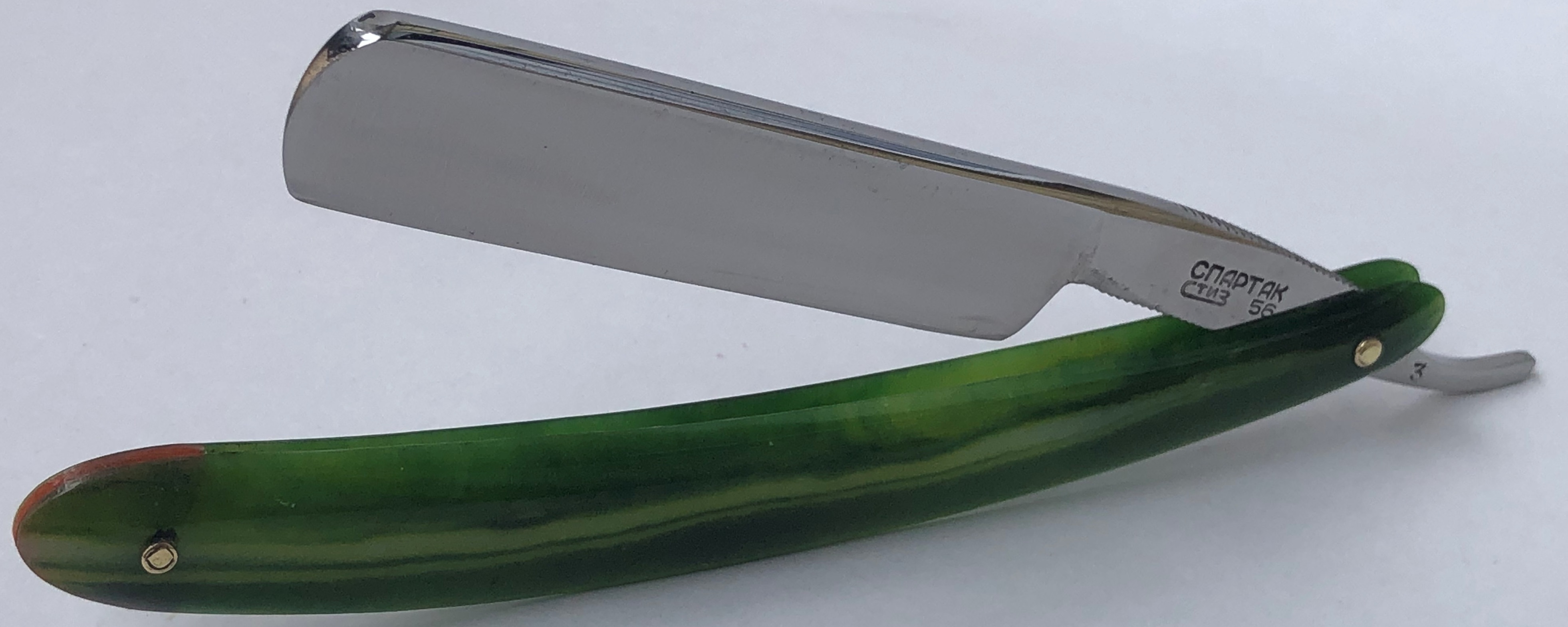Бритва коллекционного состояния,изначально была с заводской заточкой. Была разобрана, для удаления окисления в районе осевого пина, собрана с добавлением внутренних шайб, а также с сохранением родных пинов.Сталь чистая, без видимых дефектов.Нанесение на полотне четкое, без потертостей.Заводская шлифовка и полировка.Идеальная геометрия клинка. Эффектная ручка цвета малахита. В тон ручки родная коробочка также 1958 года! Идеальный вариант для новичка и в коллекцию.