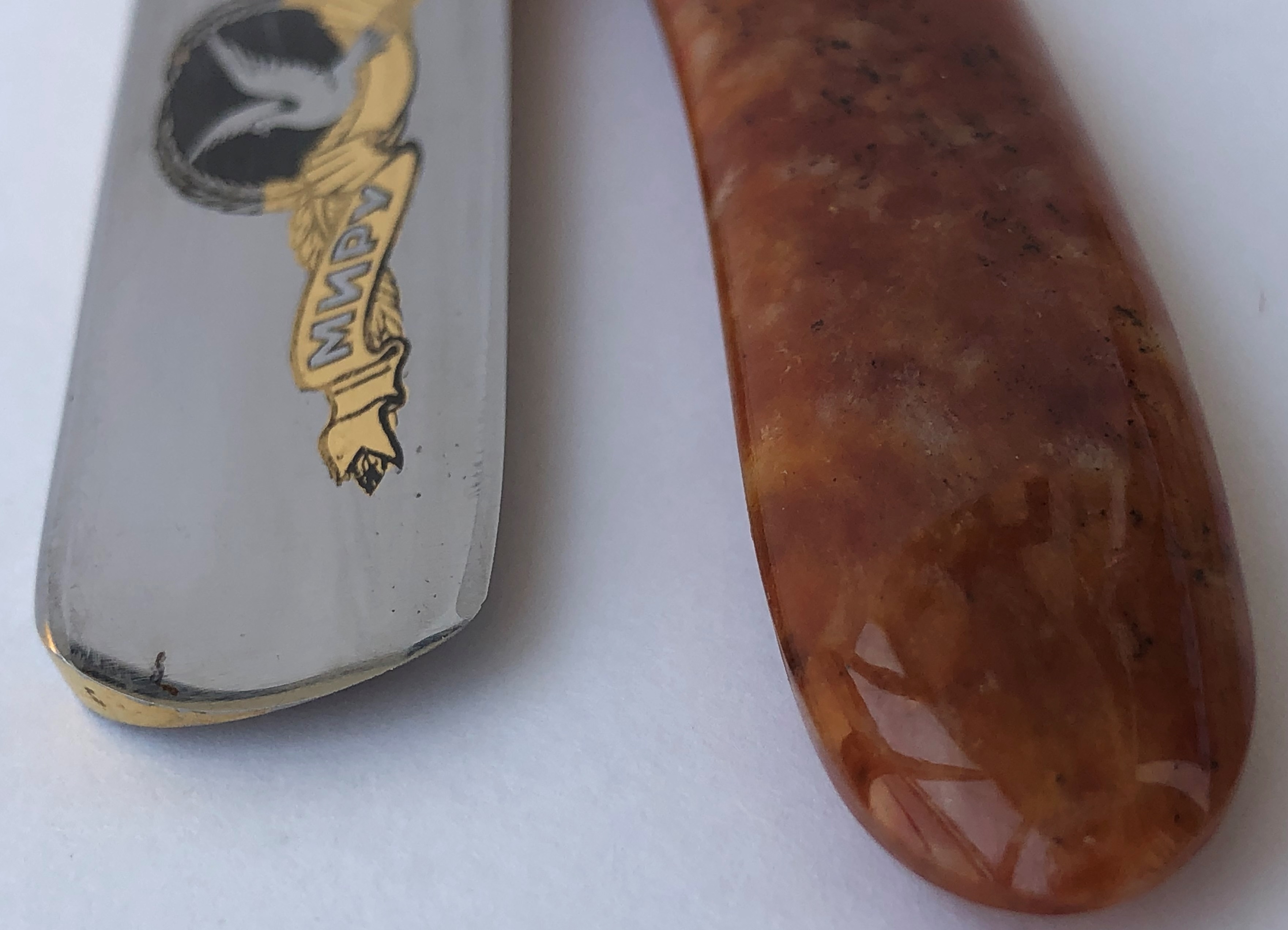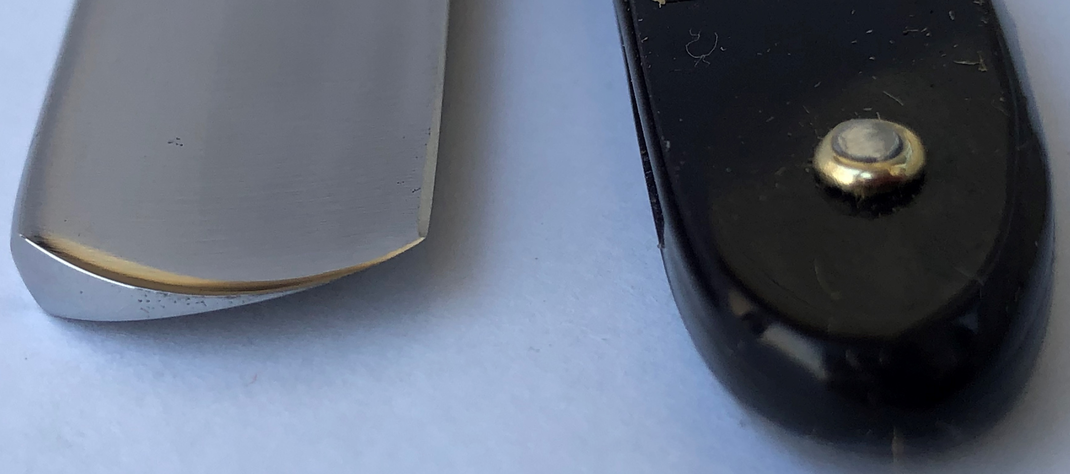 (донор довоенный, примерно 20-30-е годы).Плашки оправы прочные и достаточно толстые,без трещин и дефектов. Природный рисунок кости невероятной красоты.Понятно, что японцы не ставили на свои бритвы (по крайней мере я не видел ничего подобного) ручки из натуральных материалов,но в этот раз захотелось чего то неординарного.Из за свой формы клинка, а также размеров оправы,бритва достаточно тяжёлая и приятно лежит в руке.Бритва заточена и лично протестирована. Бреет прекрасно и без вопросов.