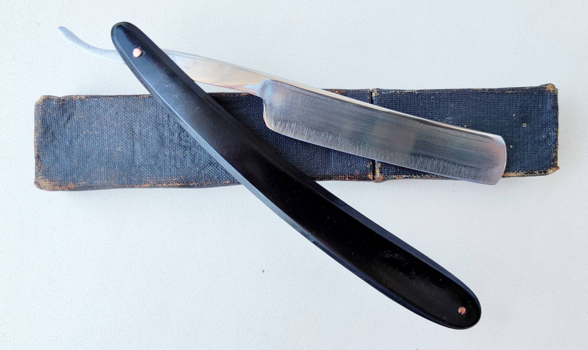 Опасная бритва завода Труд Вача Росинструмент, изготовлена в довоенный период (т.к. в 41 уже начали год на эрле ставить), из ранних, примерно 36-39 г. Ширина полотна 16 мм, все родное, футляр тоже. Вручную почистил и заточил. Подготовлена мной к бритью. На полотне остались следы от старого гринда (кромка чистая и без дефектов). Оправа оригинальная, похожа на целлюлоид, пины родные медь. Сталь тут старая традиционная, отличное удержание кромки, профиль близок к полуклину - то что нужно для жесткой щетины. Клинок интересной и стремительной формы - с выраженной улыбкой. Закрытие клинка не по центру, нужно центровать пальцами, на фото показал. Цена 5000 руб. К бритве рекомендую приобрести ремень для правки опасных бритв моего изготовления из итальянской кожи. Spoiler Show Кто сейчас на конференцииСейчас этот форум просматривают: нет зарегистрированных пользователей и 6 гостей | |