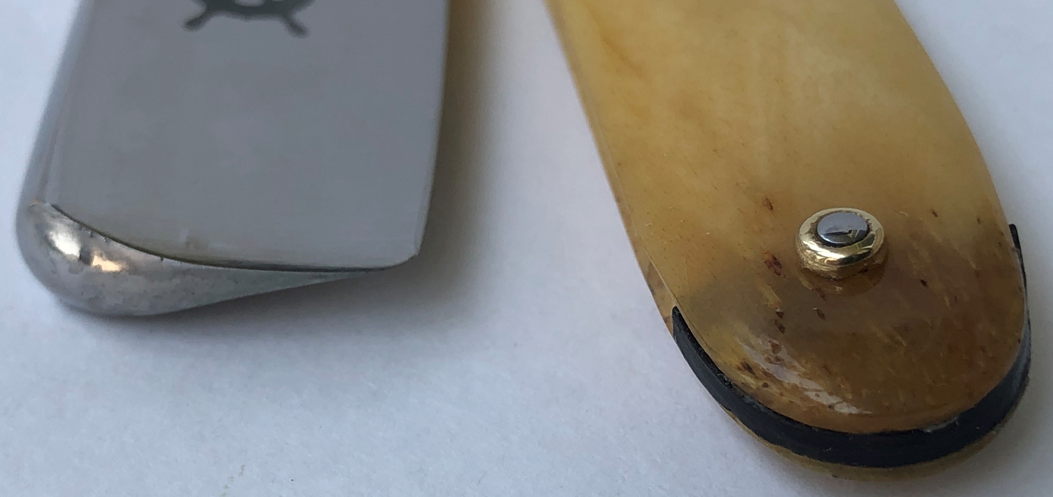 Бритва без следов пользования,но пришлось разобрать, для удаления следов окисления в районе осевого пина.Заменил медную заклепку на двух-цветную втулку,а также добавил внутренние шайбы.Заводская шлифовка и полировка полотна. Идеальная геометрия:кромочка равномерна по всей длине полотна.Очень хороший и недорогой вариант для новичка..