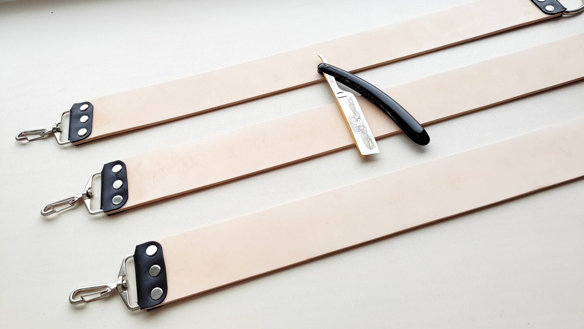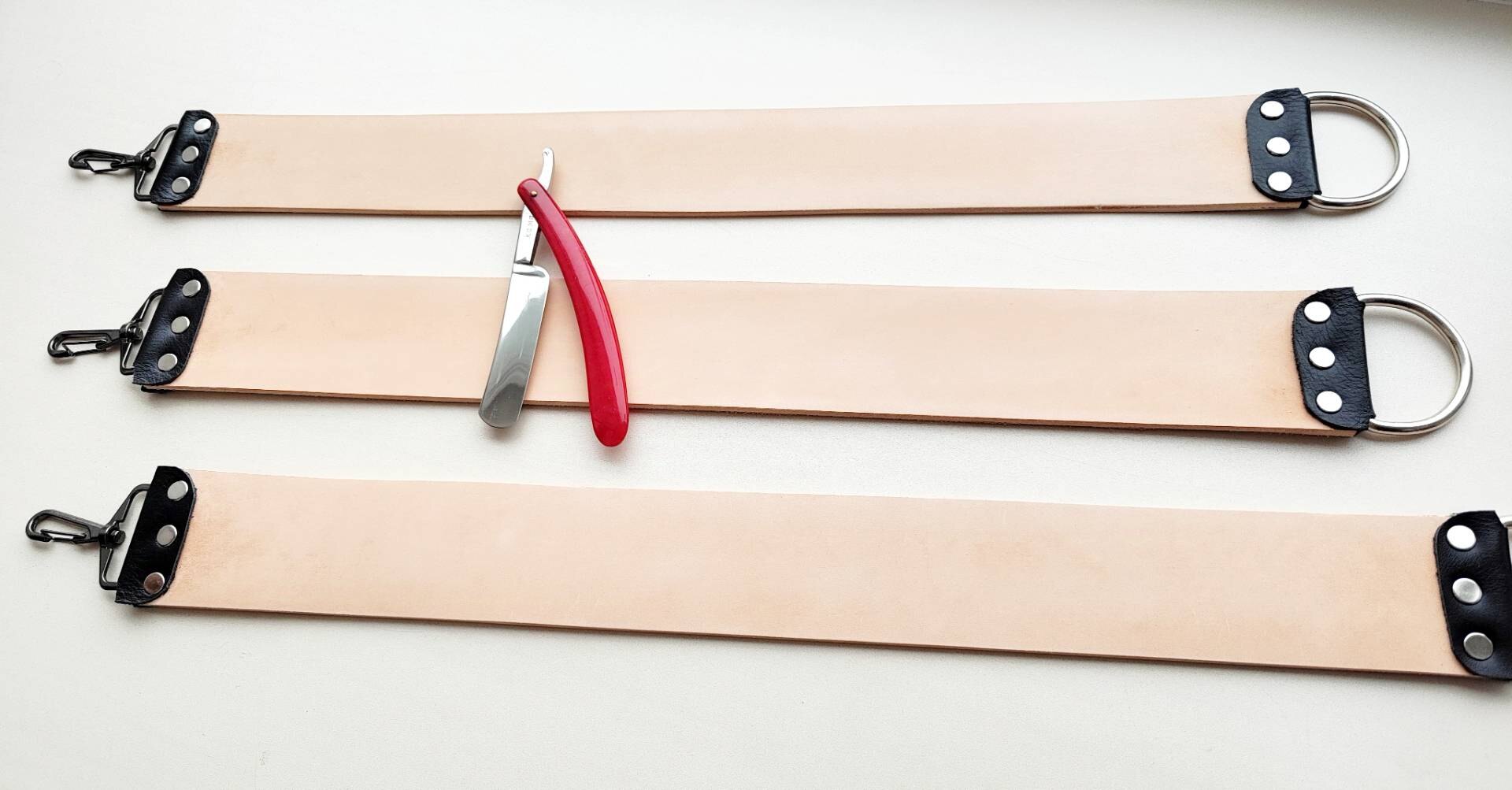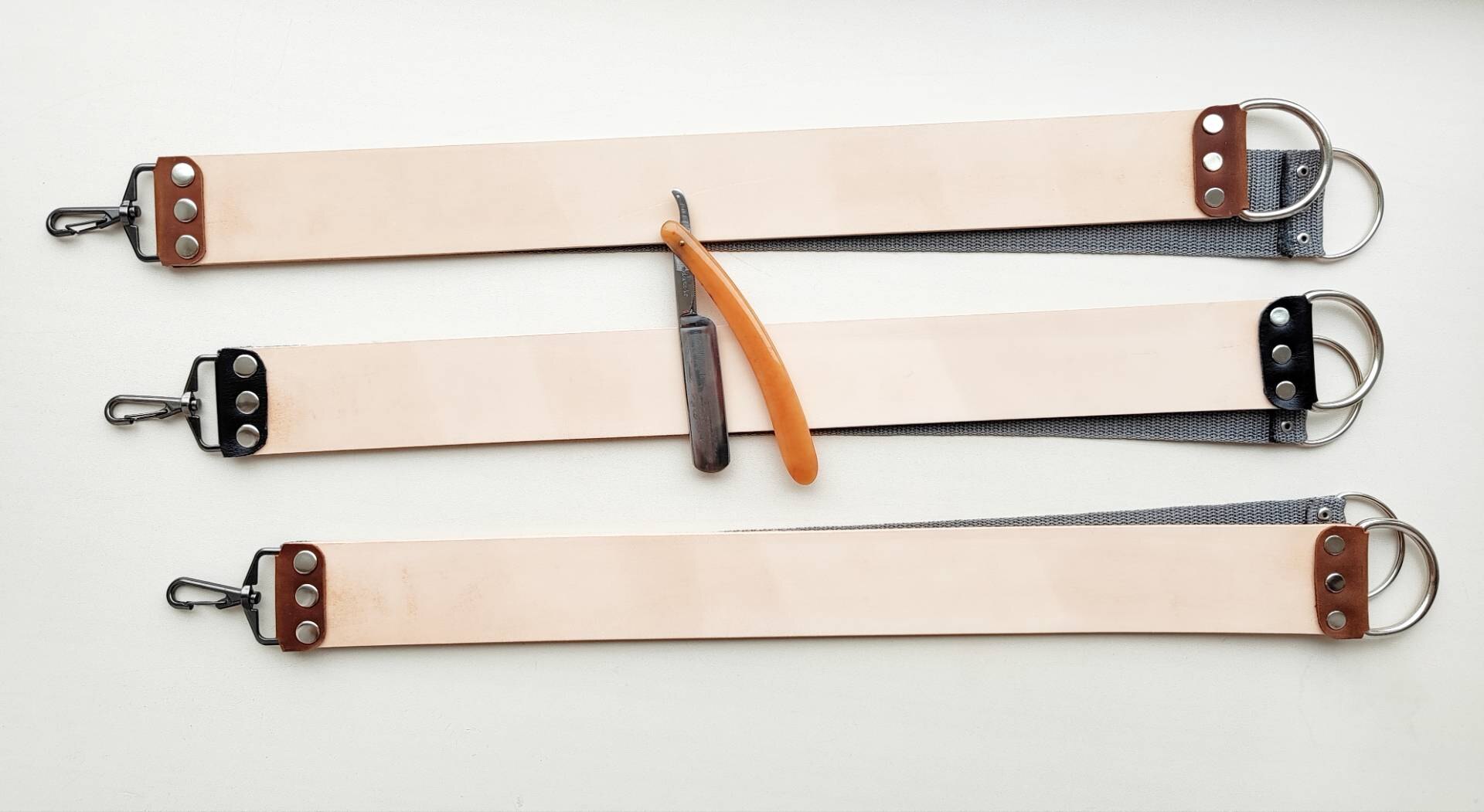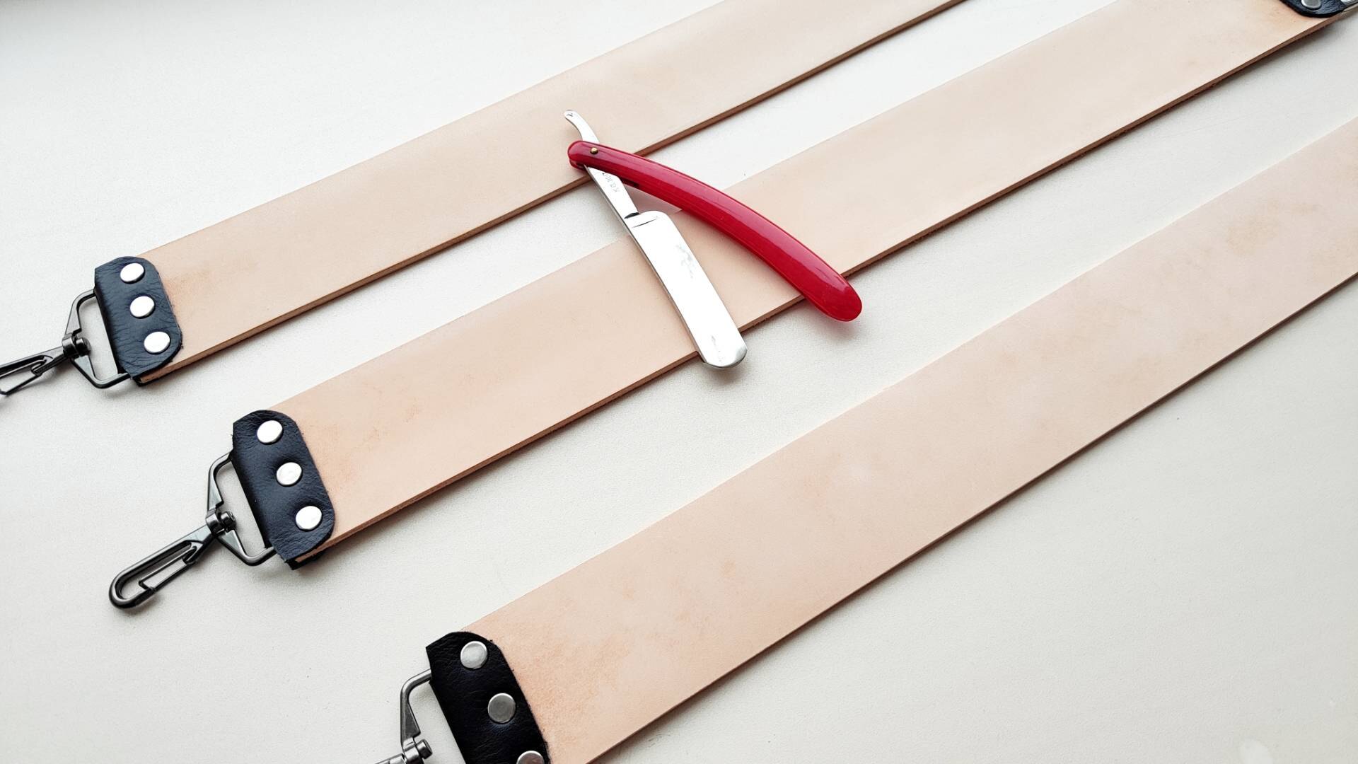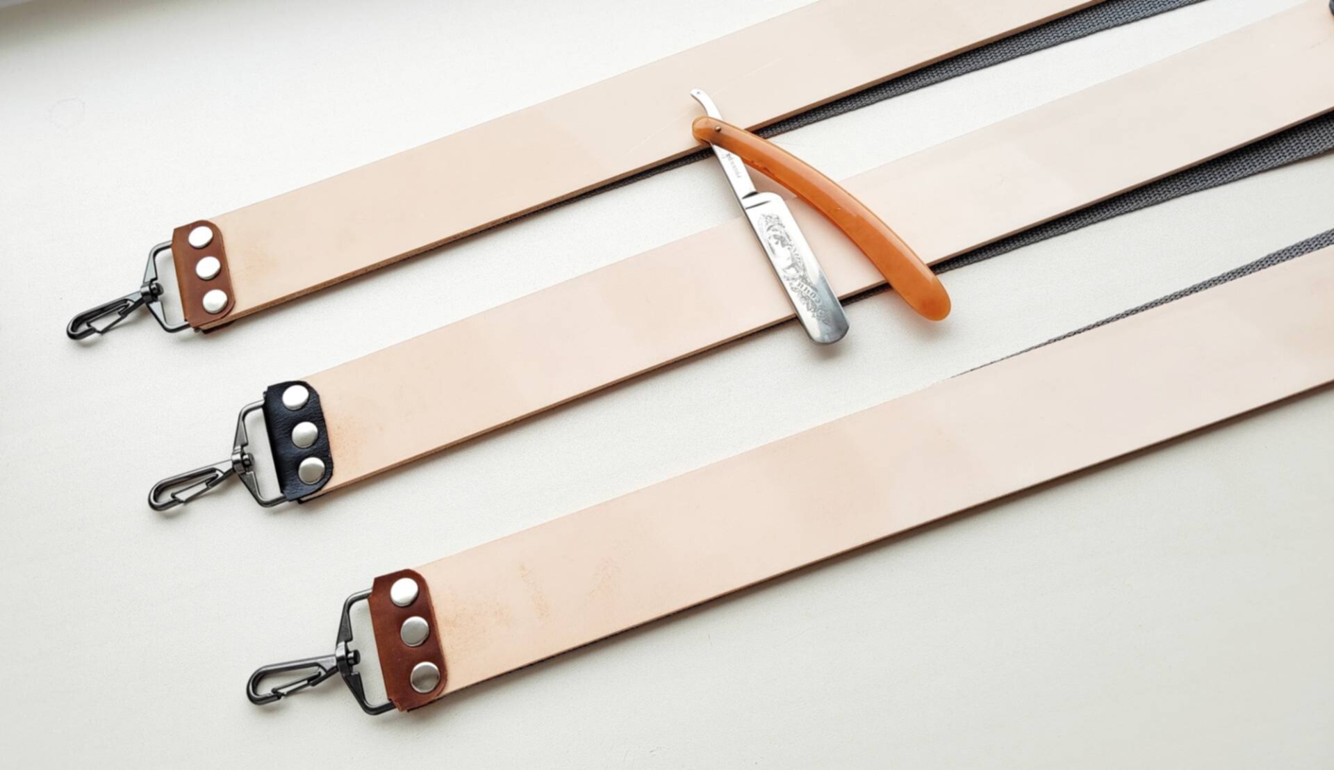 Ремень для правки опасных бритв, стандартный, 51 мм, с синтетической стропой, итальянская кожа КРС растительного дубления (чепрак). На ощупь ладонью ощущается очень мелкий и бархатный микроворс - под быструю и эффективную правку бритв любой твёрдости, как раз он и правит кромку. Ремень подготовлен к правке, поверхность прокатана и отшлифована до Р2500. На поверхности кожи могут быть более тёмные места, на работу не влияет. Это "растишка", она не подвергалась хим. дублению и окрашиванию, поэтому могут быть участки, отличающиеся по цвету, на правку это не повлияет. Нержавеющая фурнитура, удерживающие элементы из натуральной кожи, все ремни новые, изготавливаю сам. К ремню прикреплена дополнительная синтетическая стропа, служит для предварительной правки, удаления чешуек/махры/микровлаги после бритья с кромки, а так же может использоваться для нанесения пасты или абразивного спрея (следите, чтобы паста или спрей не попали на основной кожаный ремень). Длина ремня - от 500 мм Ширина - 51 мм Толщина кожи - 3.8-4 мм Толщина синтетики - 1 мм. Инструкцию по использованию и хранению ремня вышлю, опасная бритва с фото не продаётся. Цена 3210 руб. Spoiler Show