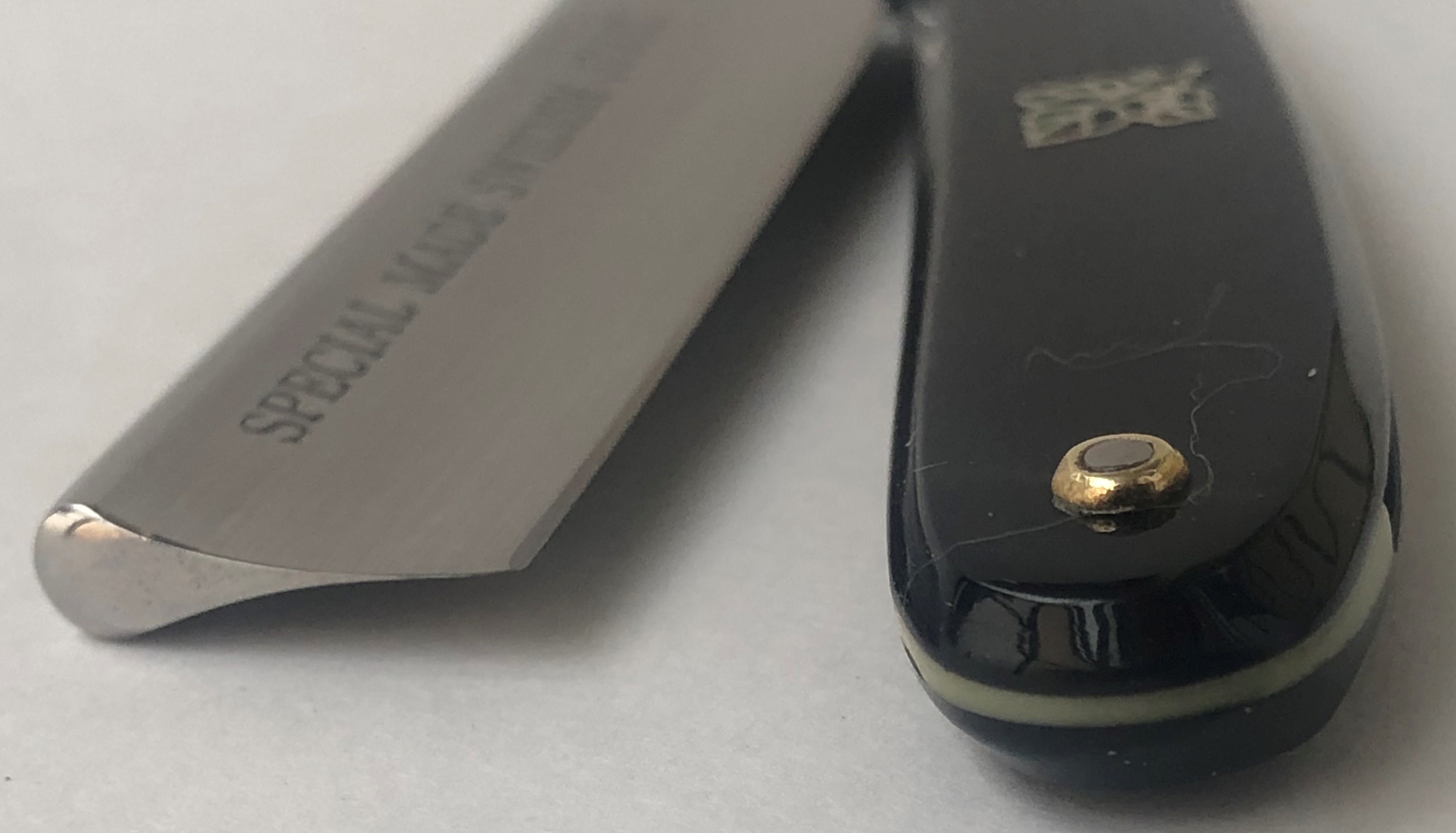 Бритва в идеальном состоянии.Только отчистил от остатков масла с консервации. Ничего не разбиралось и не реставрировалось. Оригинальная шлифовка и полировка.Кромочка равномерна по всей длине и еле заметна.Сталь чистая, без видимых дефектов. (Не считая практически незаметных пятнашек у носика, от взаимодействия металла и платика оправы).Я не помню, чтобы мне попадалась SK-3 и шириной полотна в 22 мм. Крупная и тяжёлая. На некоторых 3-ках я не наблюдал фирменной "ступеньки" на полотне, как на бритвах 1-й и 2-ой модели.Тут эффектный "переход жесткости" имеется, так что все в норме.