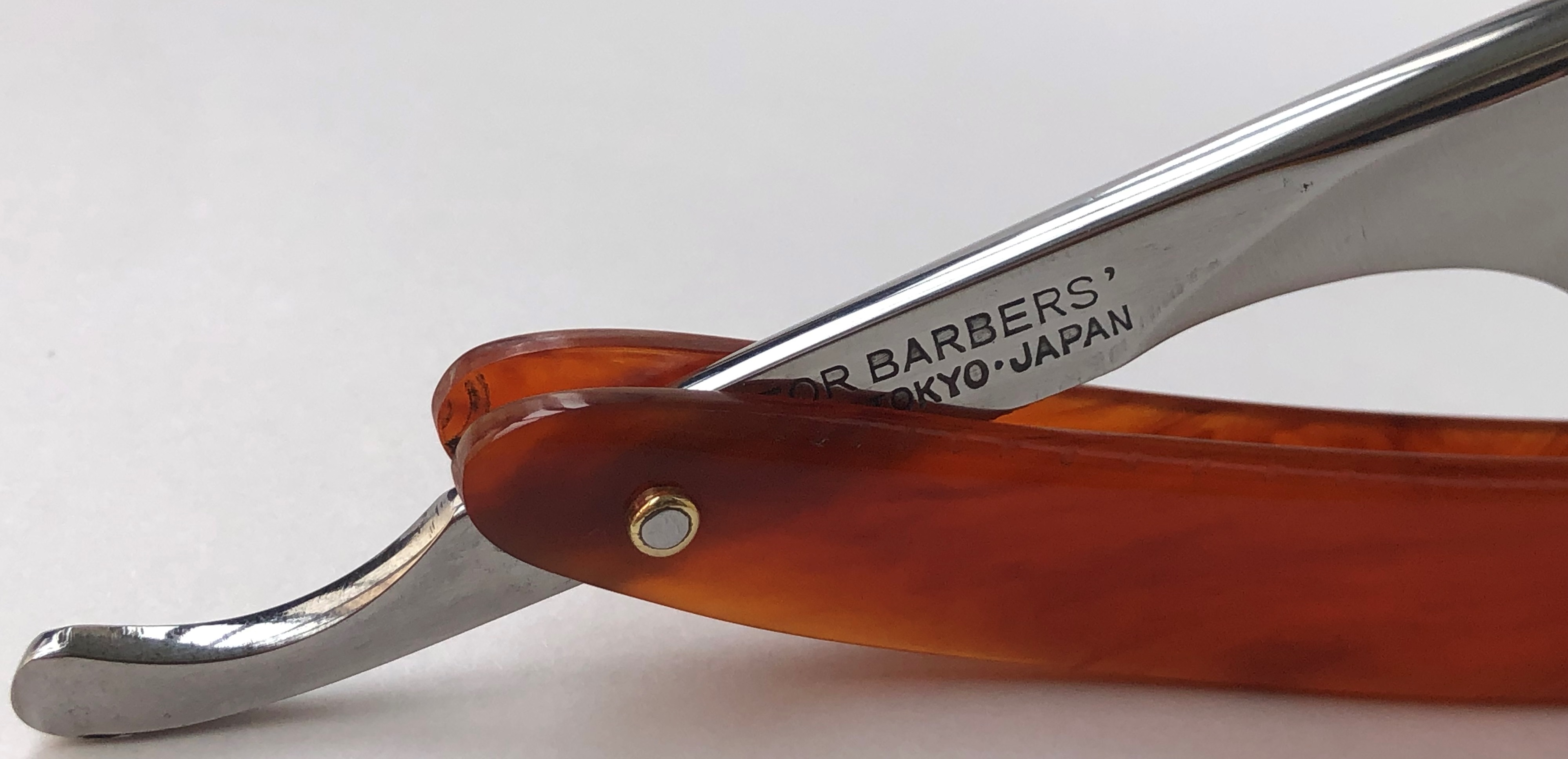 Шикарная и редкая коллекционная вещь. Одни из самых желанных японских бритв для любой коллекции, каждого разор-маньяка.Бритва в пользовании не была, но для порядка разобрал, чтобы удалить немного лишнего окисления в районе осевого пина, не стирая эффектное (родное) воронение эрля.Оригинальные пины были также перебраны и заново установлены, с добавлением еще по одной шайбе с каждой стороны, для усиления конструкции. Продольная ручная шлифовка камнями, по принципу шлифовки катан.Почти "зеркало"с элементами сатина.