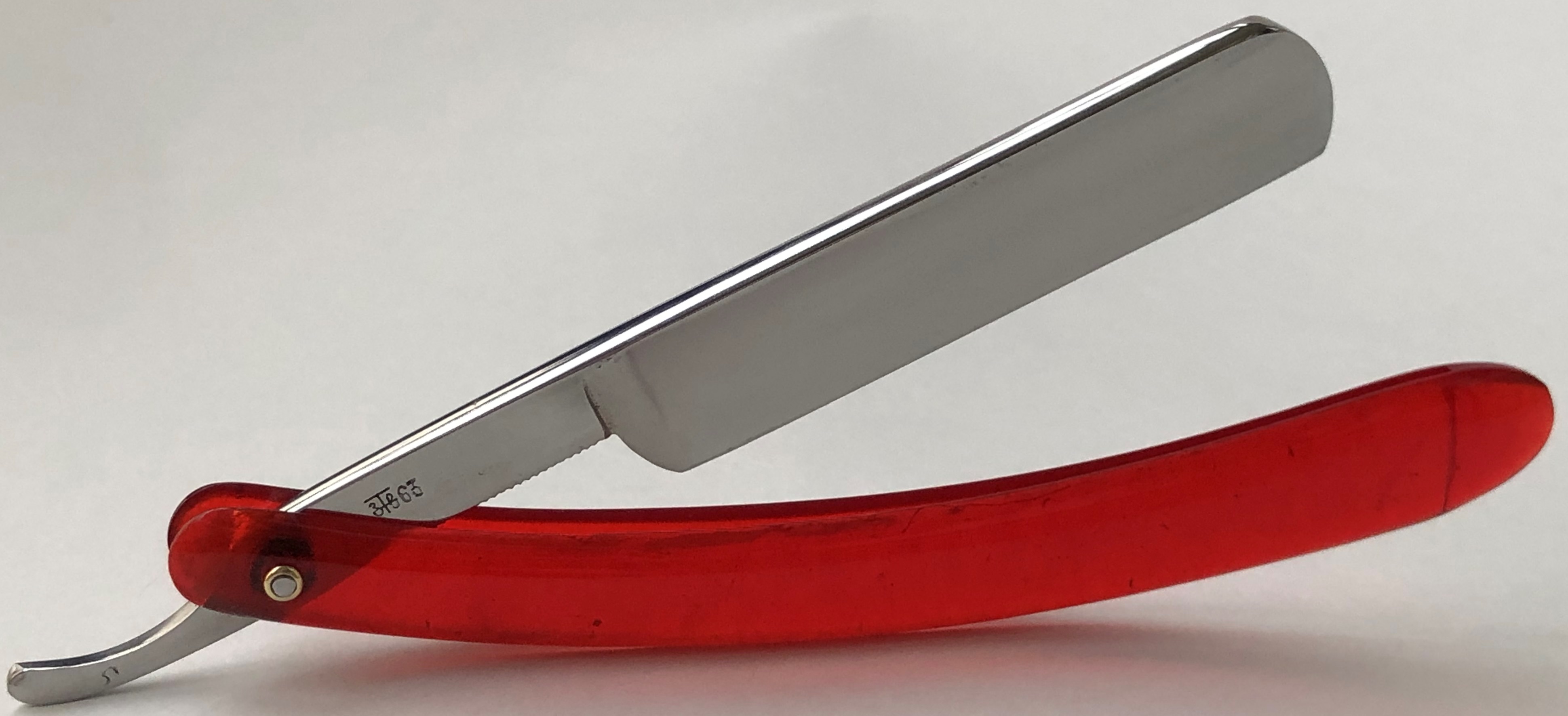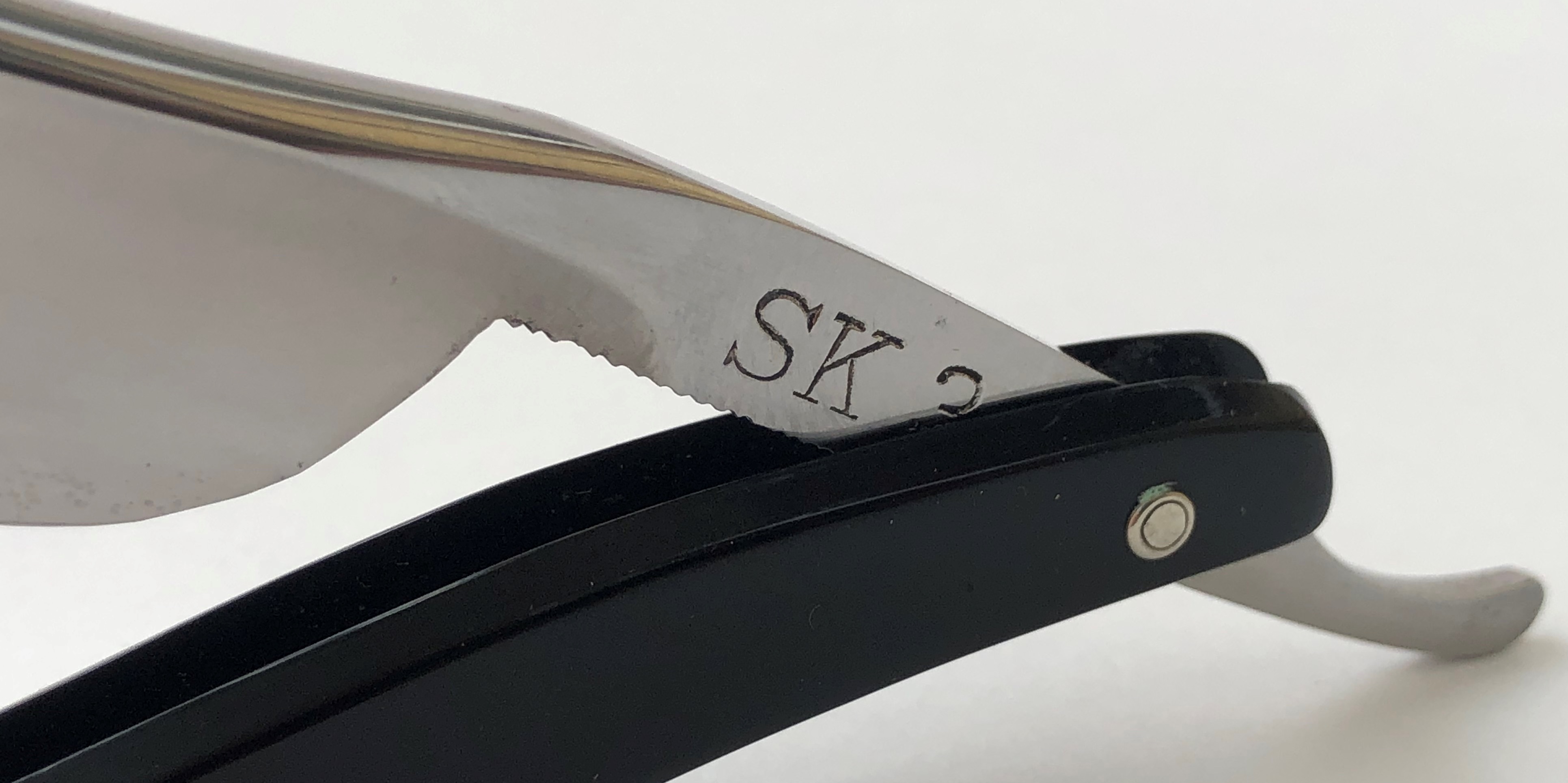 Бритва в идеальном состоянии.Только отчистил от остатков масла с консервации. Ничего не разбиралось и не реставрировалось. Оригинальная шлифовка и полировка.Кромочка равномерна по всей длине и еле заметна.Сталь чистая, без видимых дефектов. (Не считая практически незаметных пятнашек у носика, от взаимодействия металла и платика оправы).Я не помню, чтобы мне попадалась SK-3 и шириной полотна в 22 мм. Крупная и тяжёлая. На некоторых 3-ках я не наблюдал фирменной "ступеньки" на полотне, как на бритвах 1-й и 2-ой модели.Тут эффектный "переход жесткости" имеется, так что все в норме.