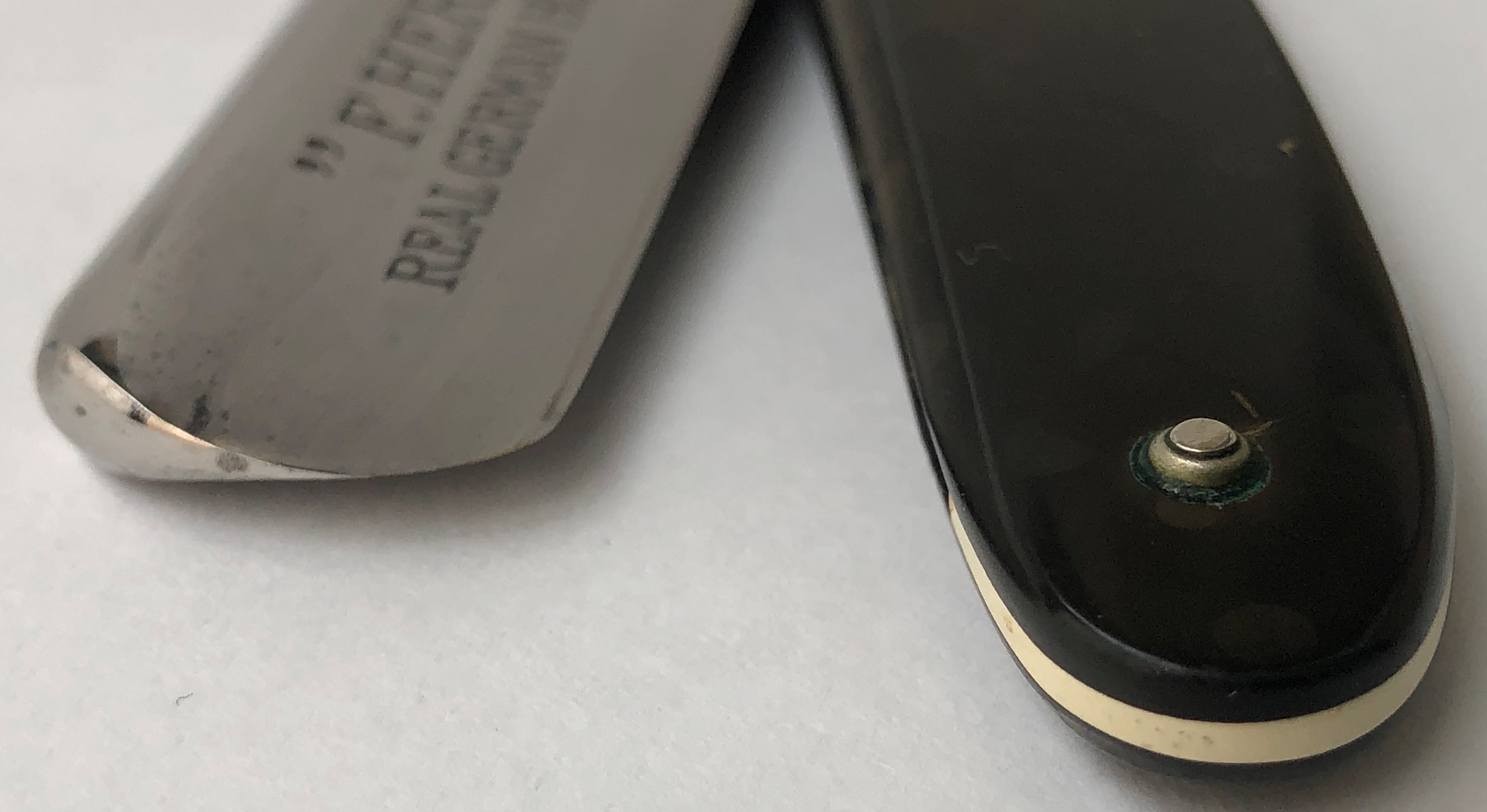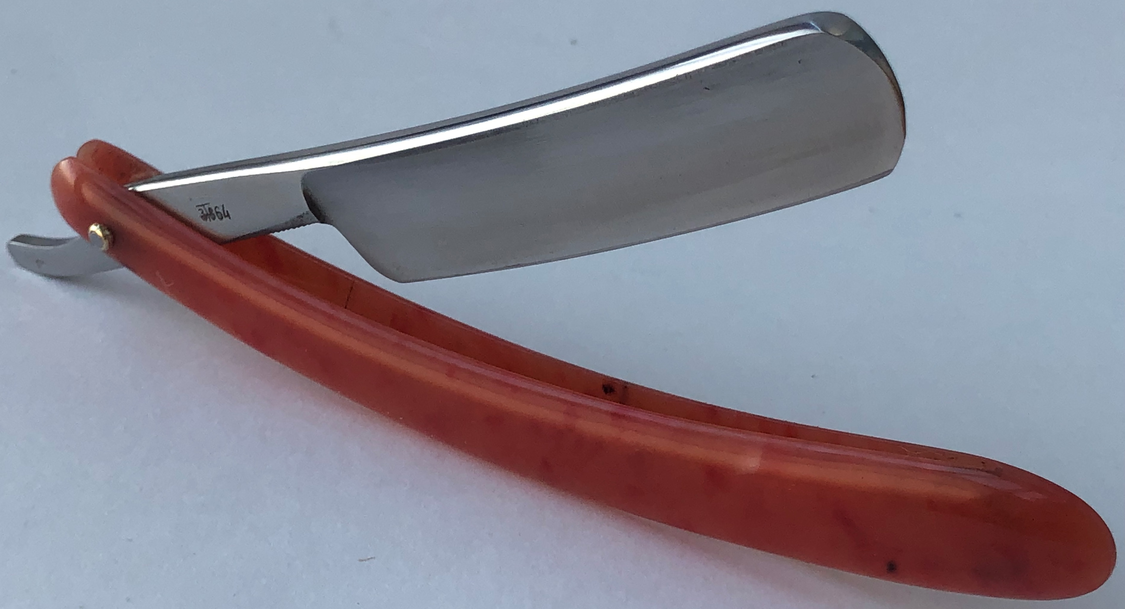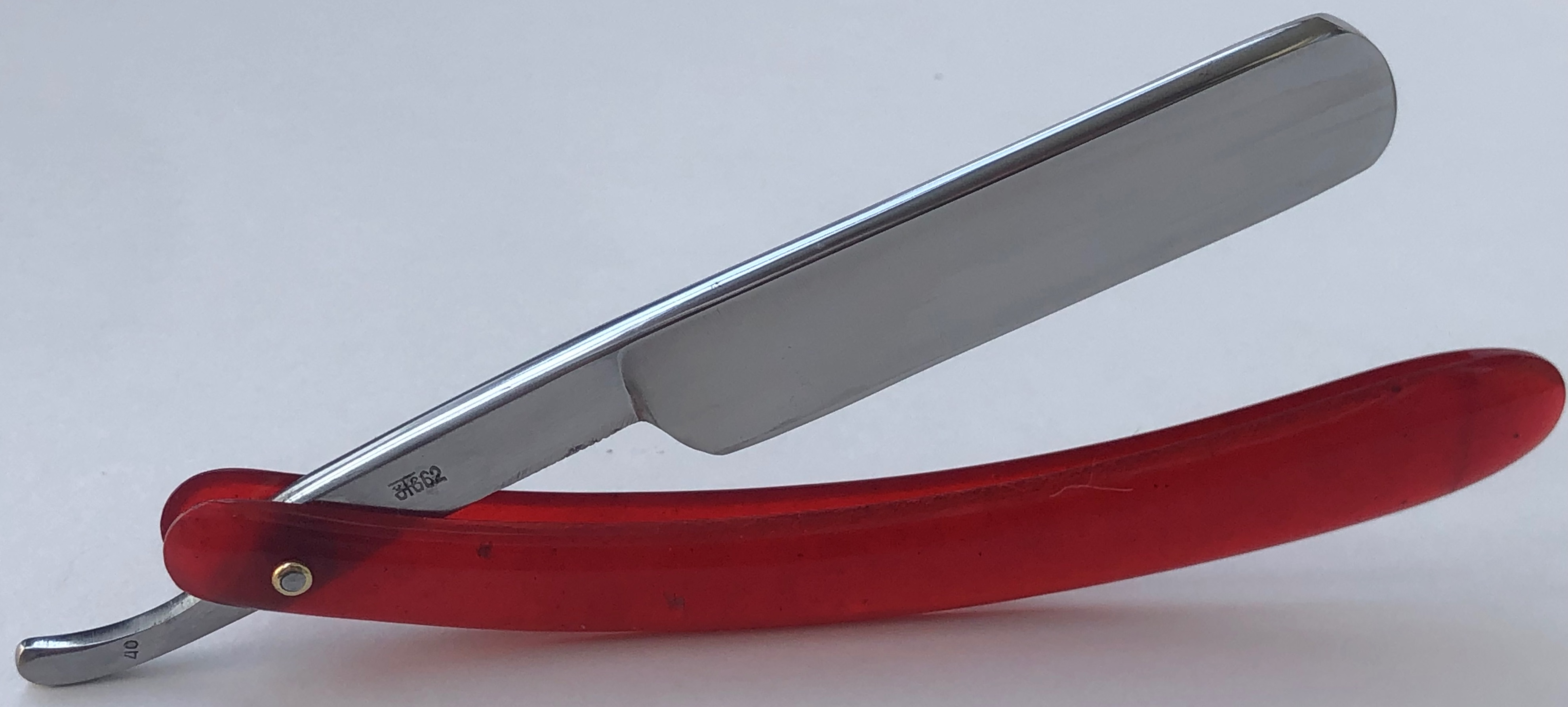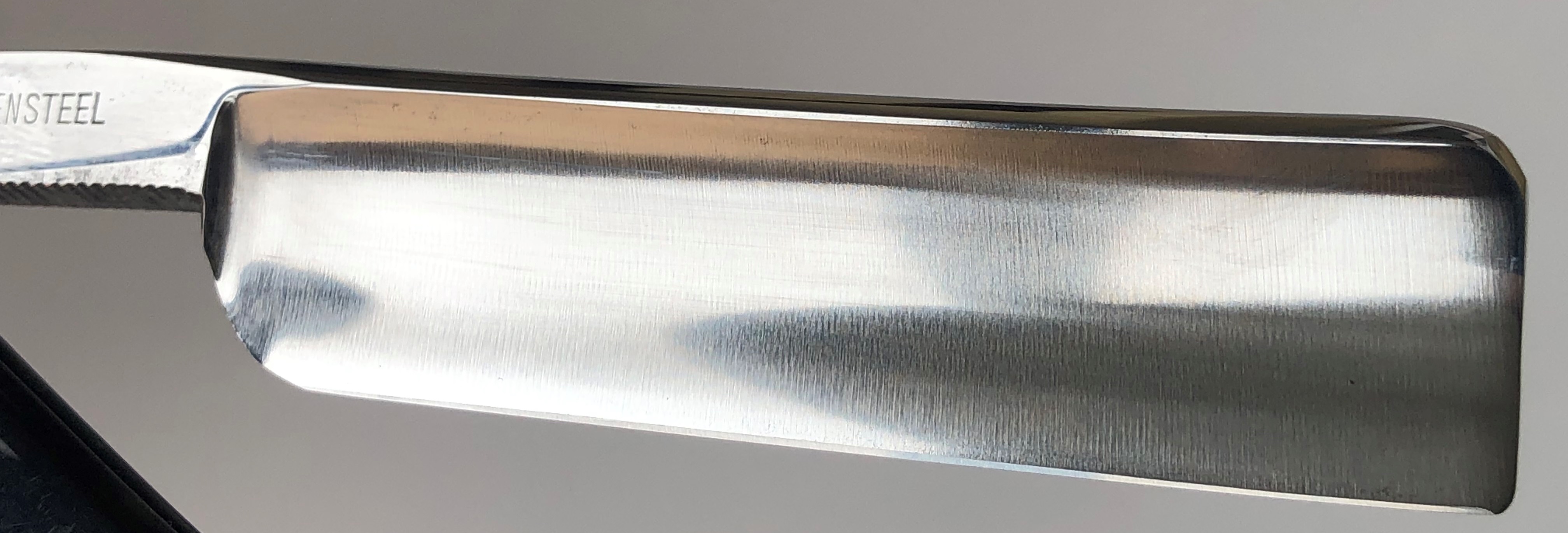 Бритва совершенно нетронута временем и заточными камнями. Оригинальная шлифовка и полировка клинка.Виден след от электро-химической заводской заточки. Ничего не разбиралось и не ремонтировалось.Идеальная геометрия полотна:кромочка равномерна по всей длине.
