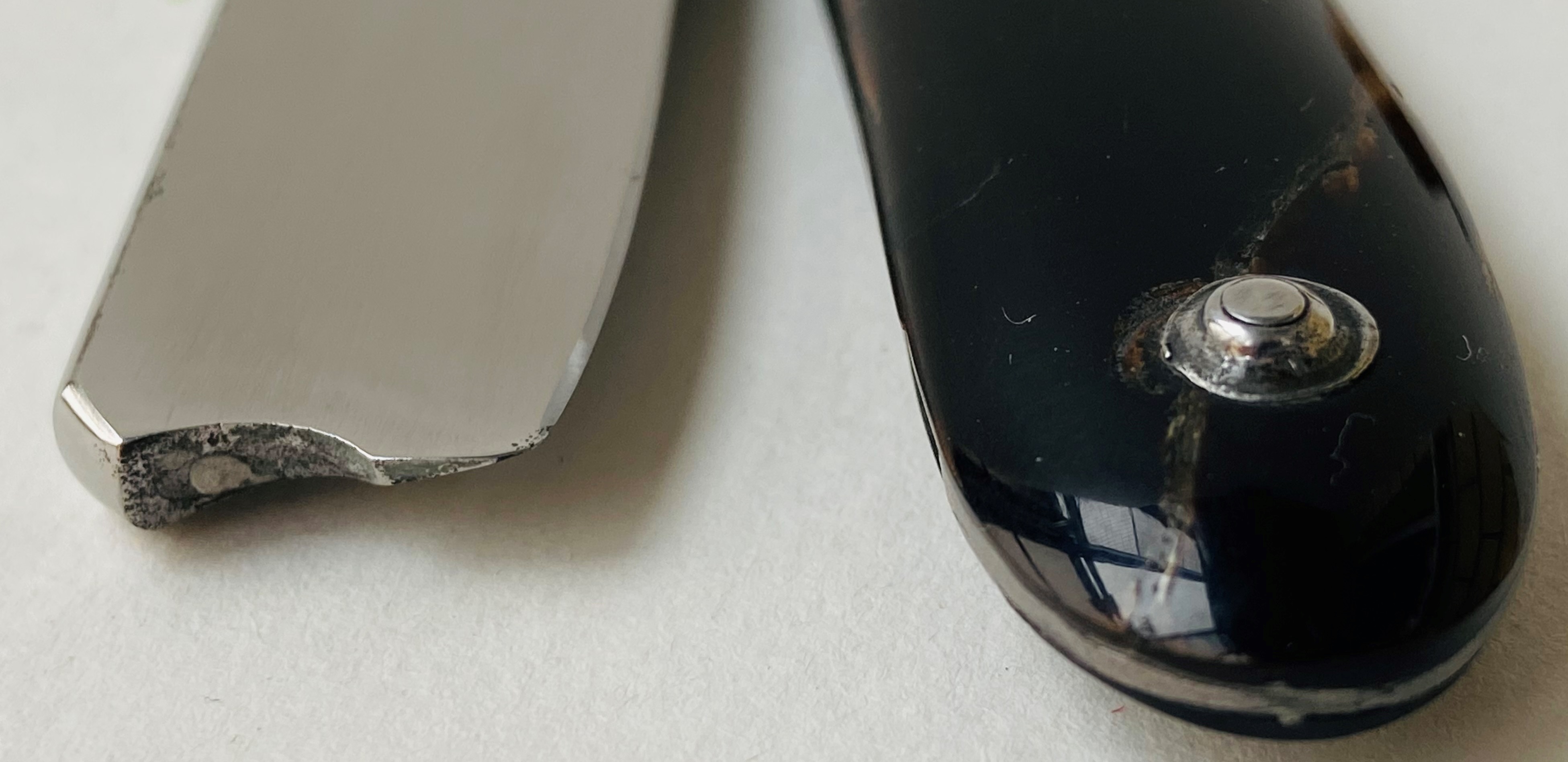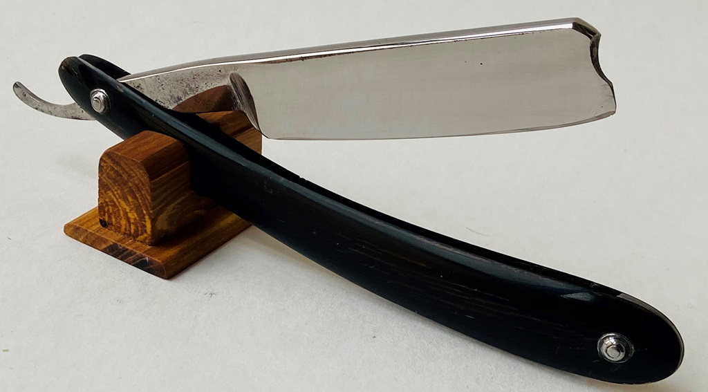 Далее уже мной сделана ручная шлифовка(до 10000 грит) и полировка.Практически в "зеркало".Остатки патины и каверн на эрле также оставил. Идеальная геометрия клинка:кромочка равномерна по всей длине и практически незаметна.Оригинальная, старинная оправа из натурального рога была отремонтирована и сейчас продолжит и далее радовать своего пользователя.Родные пины были заново переустановлены.Заточена и готова к бритью.