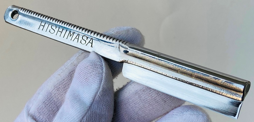1.Ширина полотна-27 мм! или почти 9/8! Толщина обушка-6.2 мм. 2.Ширина полотна-25.5 мм или 8/8! Толщина обушка-6.2 мм. 3.Ширина полотна-23.0 мм или 7/8! Толщина обушка-5.0 мм. Две бритвы определить удалось: 日下開山-Кусака Кайсан. По видимому это имя мастера. Бренд-へんこつ☆大刃-ХЕНКОТЦУ-Большой клинок. Все три примерно 50-60-х годов прошлого века. Бритву в коробочке определить не удалось,но это не отменяет ее высокое качество изготовления. Бритвы коллекционного состояния. Непользованные и не точены еще. Находились в заводской смазке,завернутые в бумажки.С бритвами ничего не делалось,даже не полировалось. Все как вчера с завода.Заводскую заточку переточил,чтобы посмотреть геометрию бритв.В этом плате все тут очень хорошо.Первые две очень редкие в таком размере и весе в 65 грамм.Так что не пропустите. Бритвы созданы классическим способом,в виде сварки из двух частей и комбинированной продольно-поперечной шлифовкой. После продажи будут заточены и доведены до состояния бритья. Цена-35500-30500-28500 р с доставкой. Внимание! Важная информация! Spoiler Show