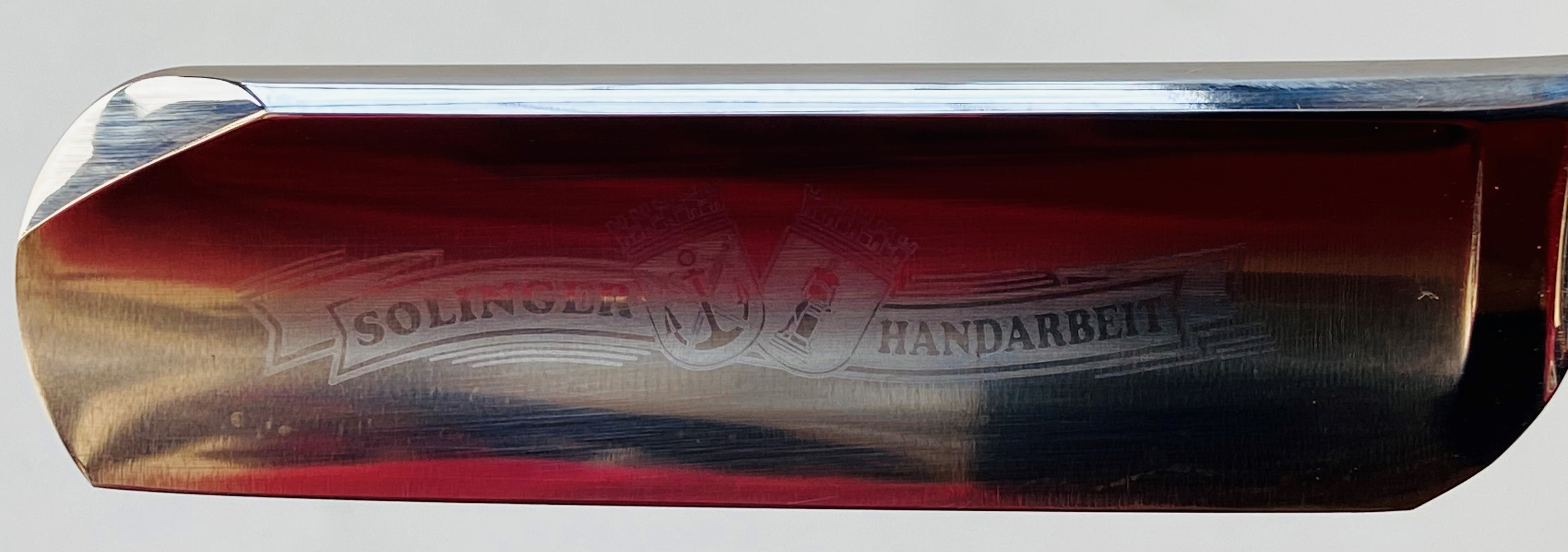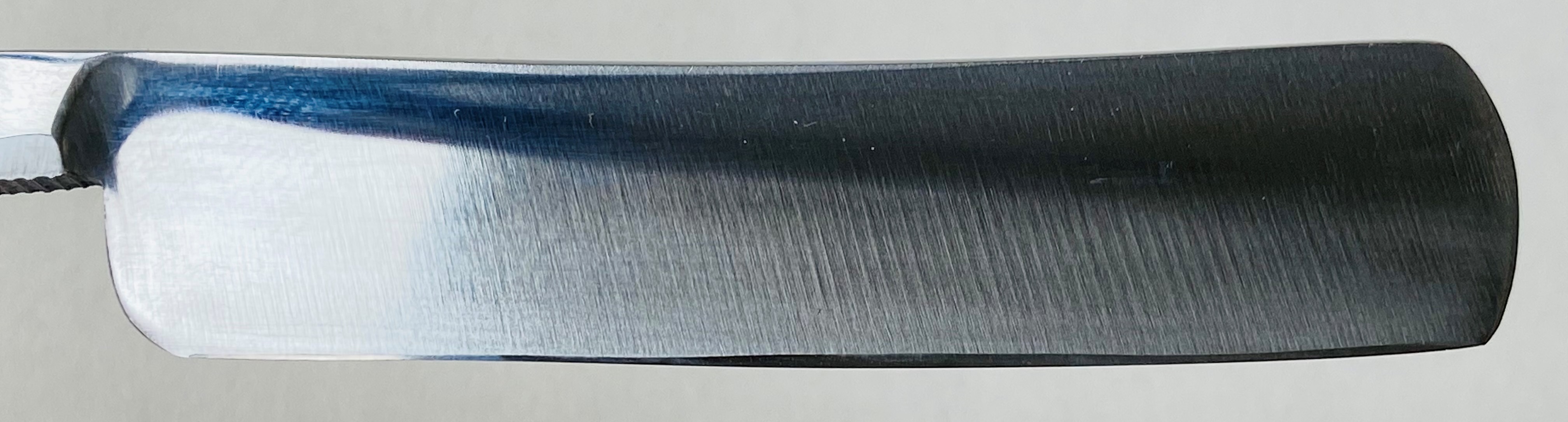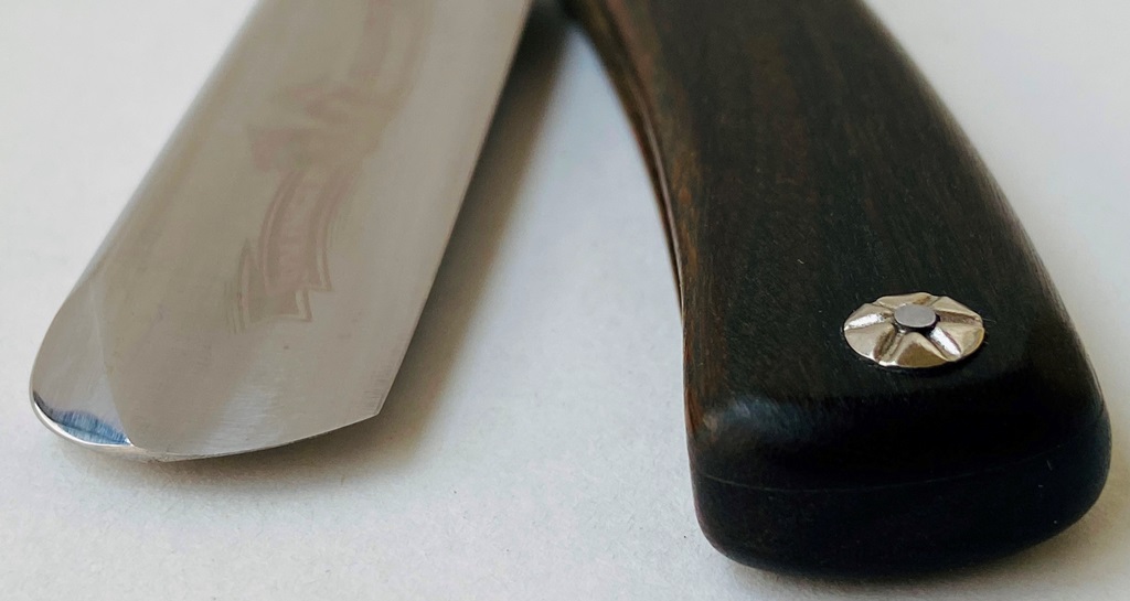 Бритва хоть и была в пользовании,но находится в хорошем,рабочем состоянии. Немного откорректировал утОчку обушка с обратной стороны полотна,а лицевую только немного аккуратно почистил,где достал,чтобы не затронуть родное травление.Шлифовка и полировка клинка ближе в зеркальному,как и должно было бы быть для подобных бритв.Осевой пин был переустановлен заново,с добавлением внутренних шайб.Мощная,родная трёх-пиновая ручка находится в очень хорошем состоянии,без дефектов.Идеальная геометрия клинка:кромочка равномерна по всей длине. Как известно,тут присутствует достаточно твёрдая сталь,так что бритва прежде всего предназначена для барберов,либо для тех,у кого достаточно жёсткий волос. Сталь тут хоть и твёрдая,но всегда шла высококачественной,без исключений.