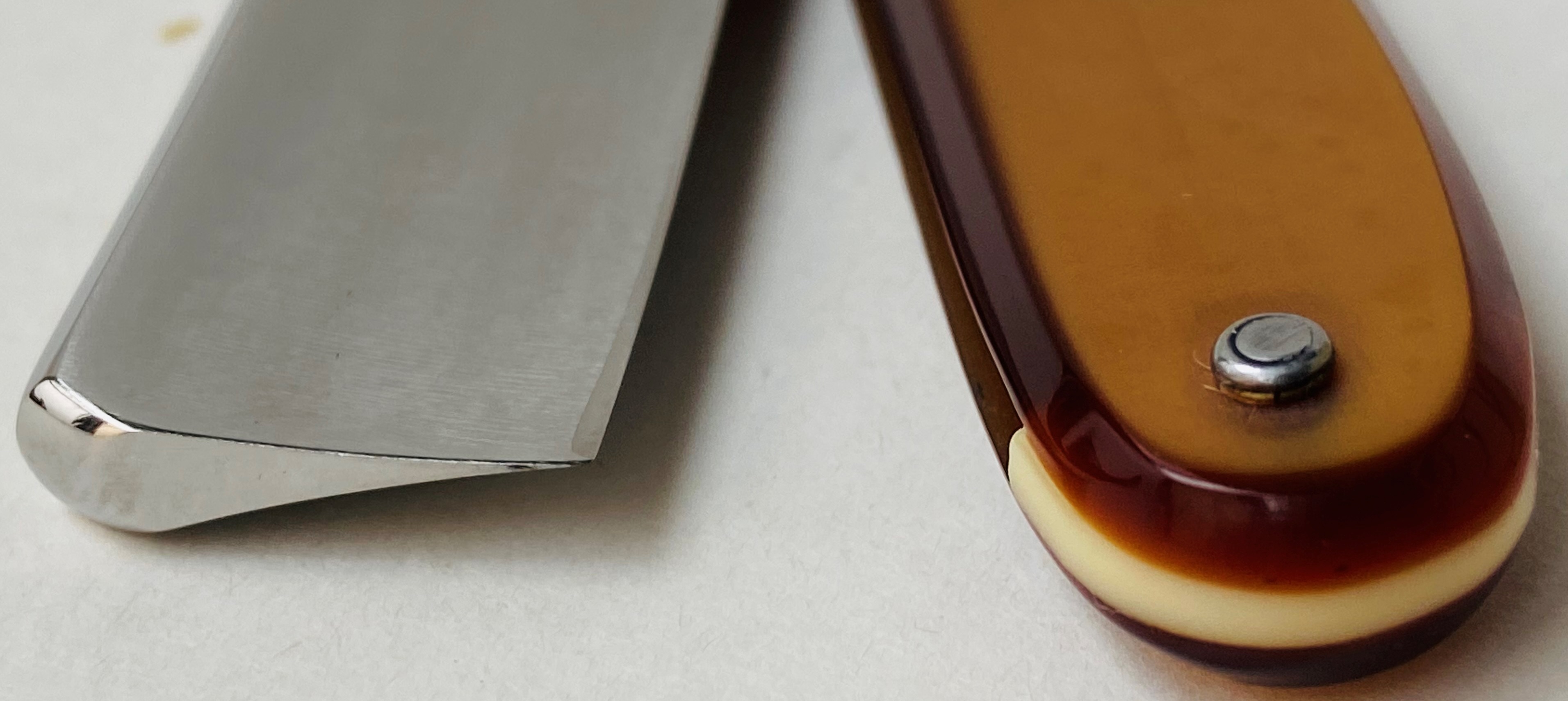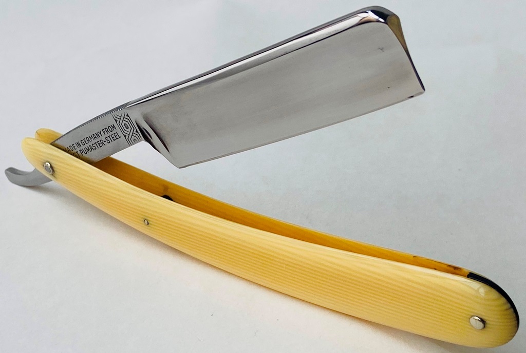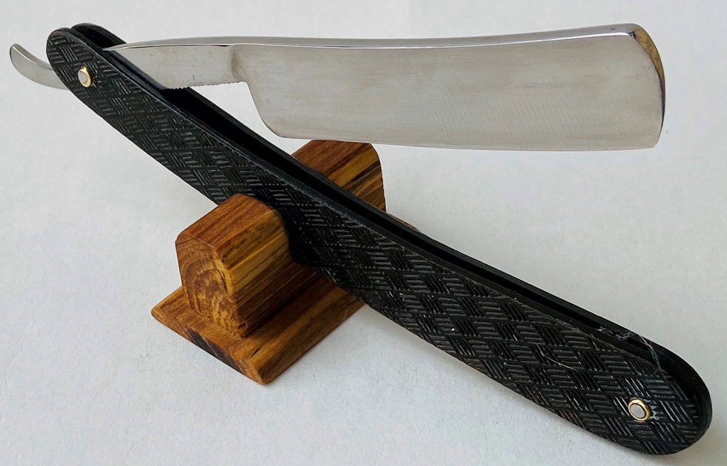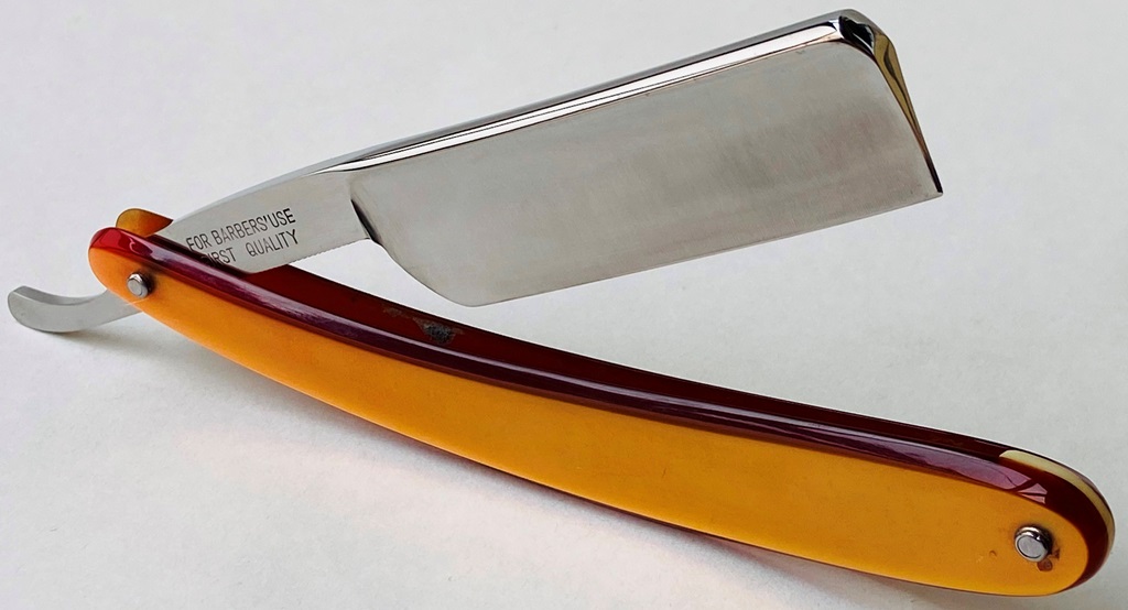 Бритва в пользовании не была,но требовала косметических работ.Минимальная шлифовка и полировка клинка. Геометрия на уровне.Новые втулки, с добавлением внутренних шайб.Родная ручка имеет "рисунок" желтоватого оттенка,по всей видимости заводского происхождения.Заточена и готова к бритью.