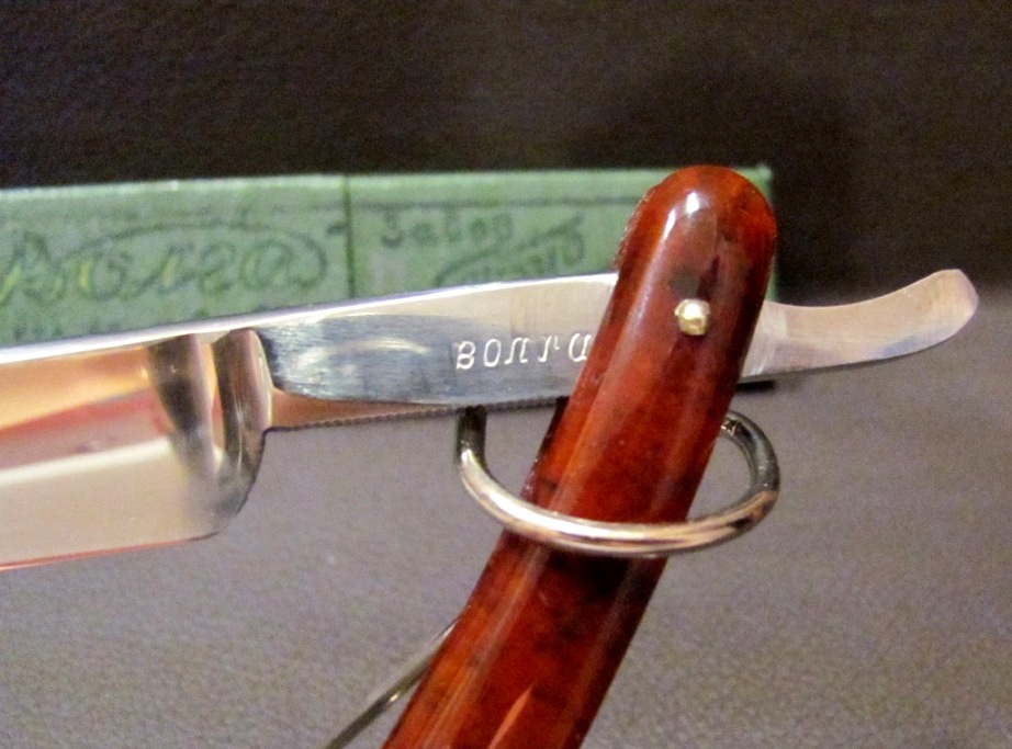 Год производства : 1924-1935. Параметры: ширина 14 мм, обух 4.2 мм Ручка : целлулоид. Состояние: после реставрации, заточена. Примечание: по середине полотна есть остаток рисунка ( типа скобочка), как он там появился, почему рисунок не весь, а только возле кромки у меня ответа нет, возможно неудачное нанесение рисунка. Личное впечатление: по качеству стали и комфорту бритья я ставлю на один уровень с Пумой. ПРОДАНА H.Boker & Co Show
