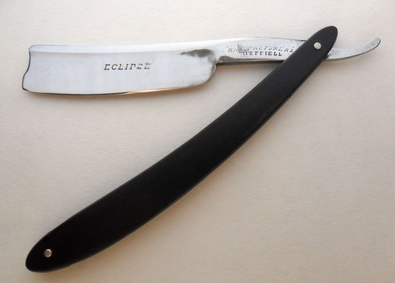 ПРОДАНА Spoiler Show Надпись на полотне: ECLIPSE Ручка и пины, по-видимому, родные, клинышек - металл. Ручка - рог, в прекрасном состоянии. С одной стороны возле головной заклепки пара трещинок-паутинок. Видимо, кто-то пытался неудачно подклепать пин. Трещинки не сквозные, более того, их размер такой, что на фото их не видно. Уверен, что проблем из-за них не возникнет. Естесственно, заточена и полностью готова к бритью. Ширина полотна 19,5 мм, толщина в обухе 5,5 мм.