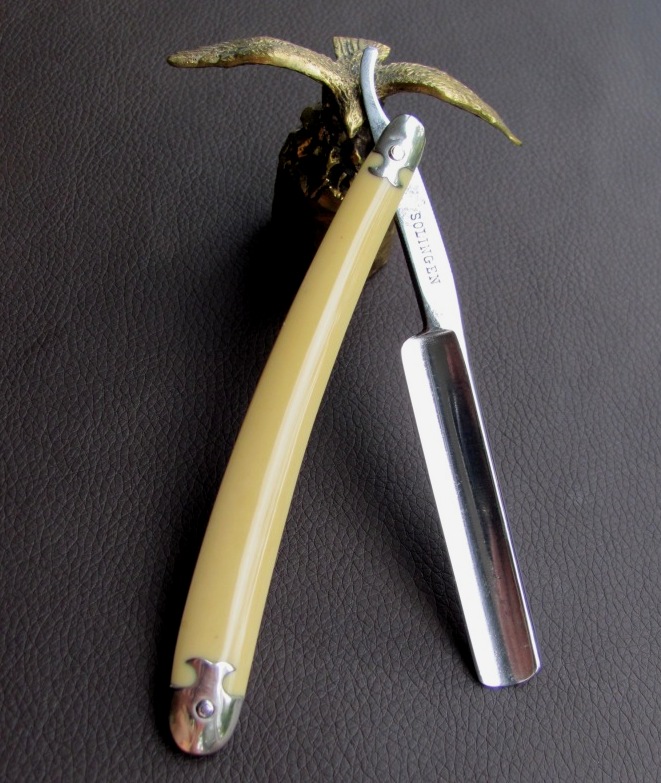 Параметры: ширина полотна 14 мм, обух 4 мм. Примечание: ручка из целлулоида, одна сторона немного искривлена ( от времени или температурного воздействия), ручка закрывается плотно (заменен осевой пин), полотно имеет легкие следы времени, бритва полностью вычищена, продезинфицирована , наточена. Цена 20 евро. L.V. Show