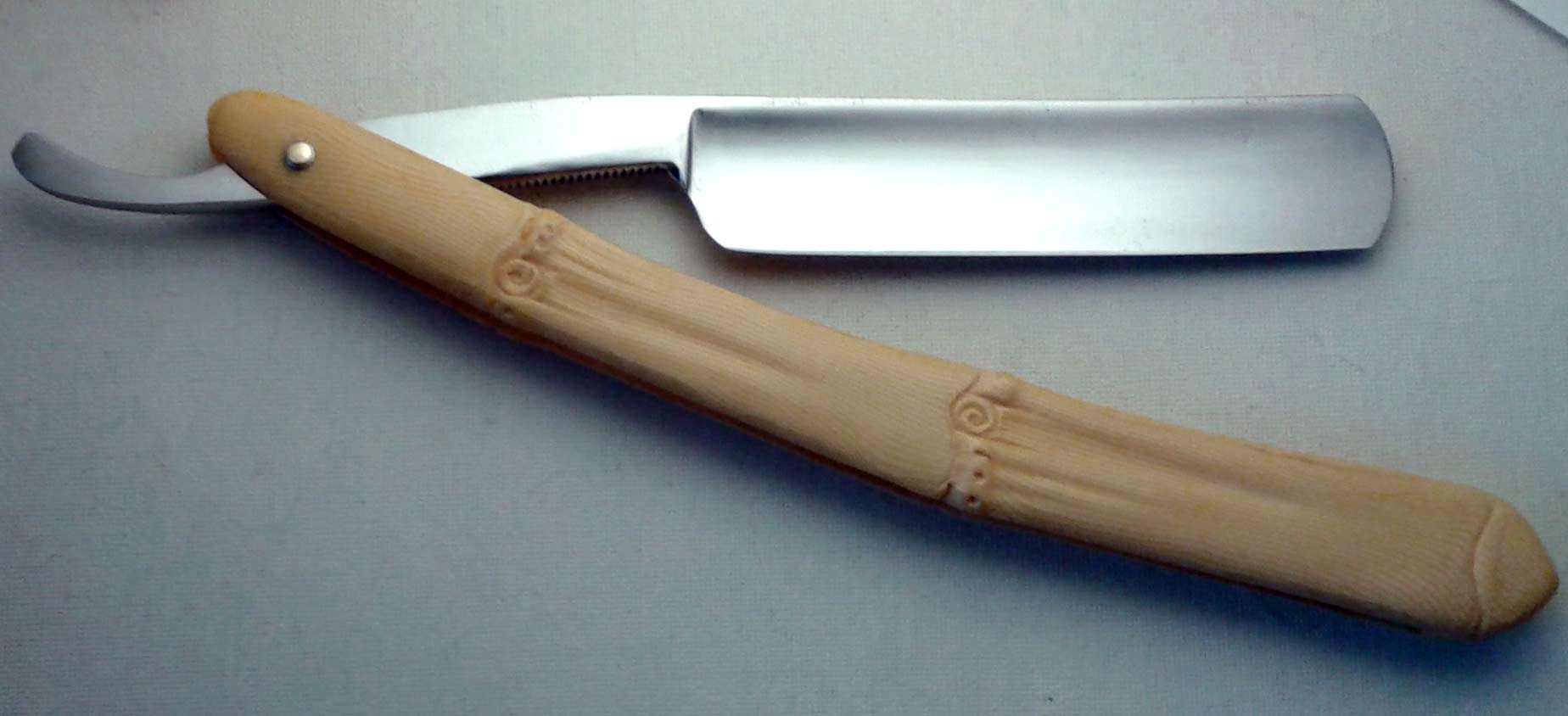Ручка - кость, в отличном состоянии. Я не особо разбираюсь, что именно за кость, но думаю, что вряд ли слоновая. Одно точно - не имитация, а вполне натуральная кость. Бритва достаточно немного была в использовании, геометрия близка к заводской. Заточена и полностью готова к бритью. Ширина полотна 17.5 мм, толщина в обушке 4.5 мм.