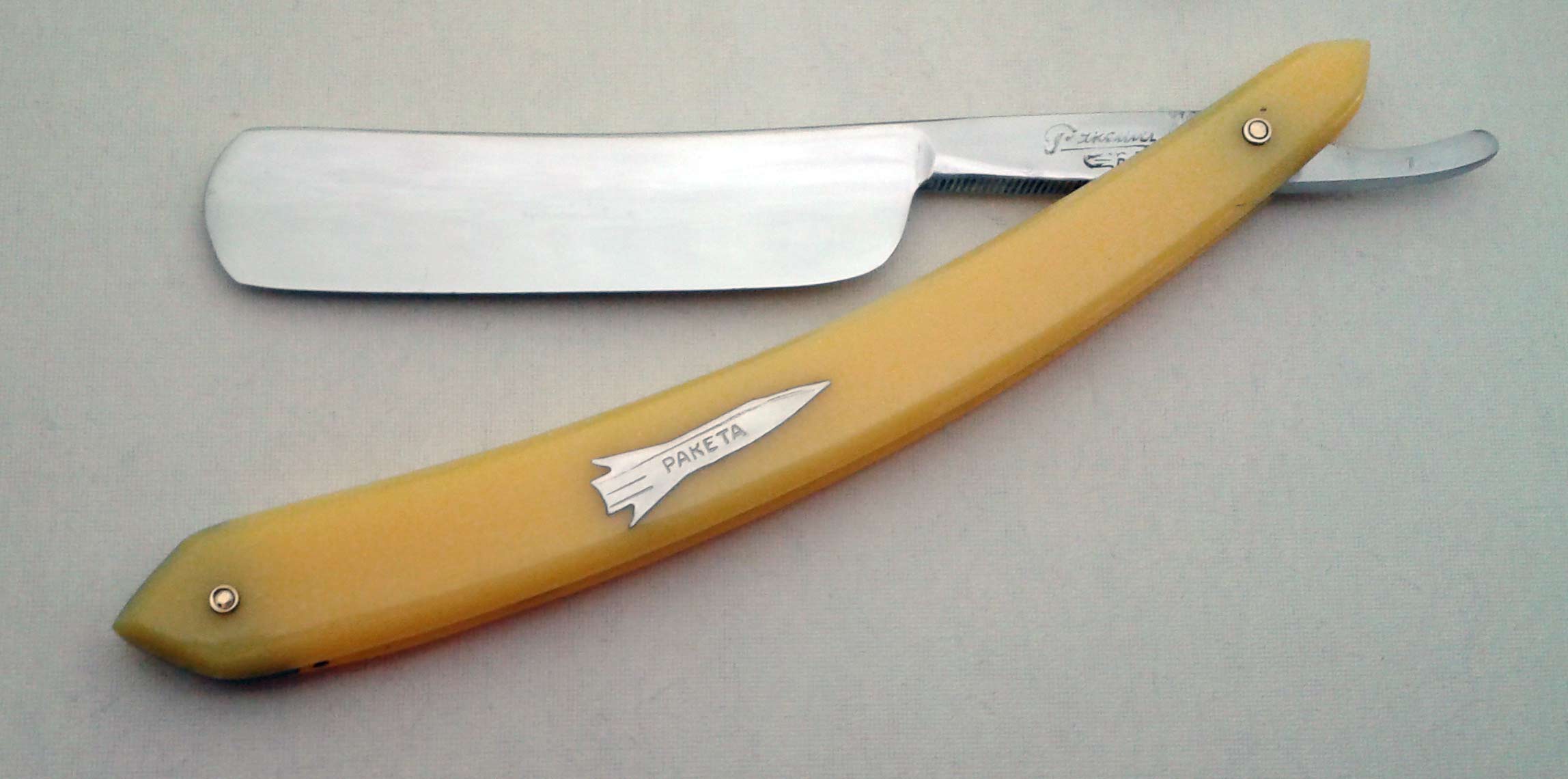 Ручка родная, в отличном состоянии. Бритва точилась, однако немного и аккуратно. Коррозии почти не было, удалось сохранить рисунок ракеты. Заточена и полностью готова к бритью. Ширина полотна 17 мм, толщина в обушке 4 мм. Цена 40 евро, доставка включена.