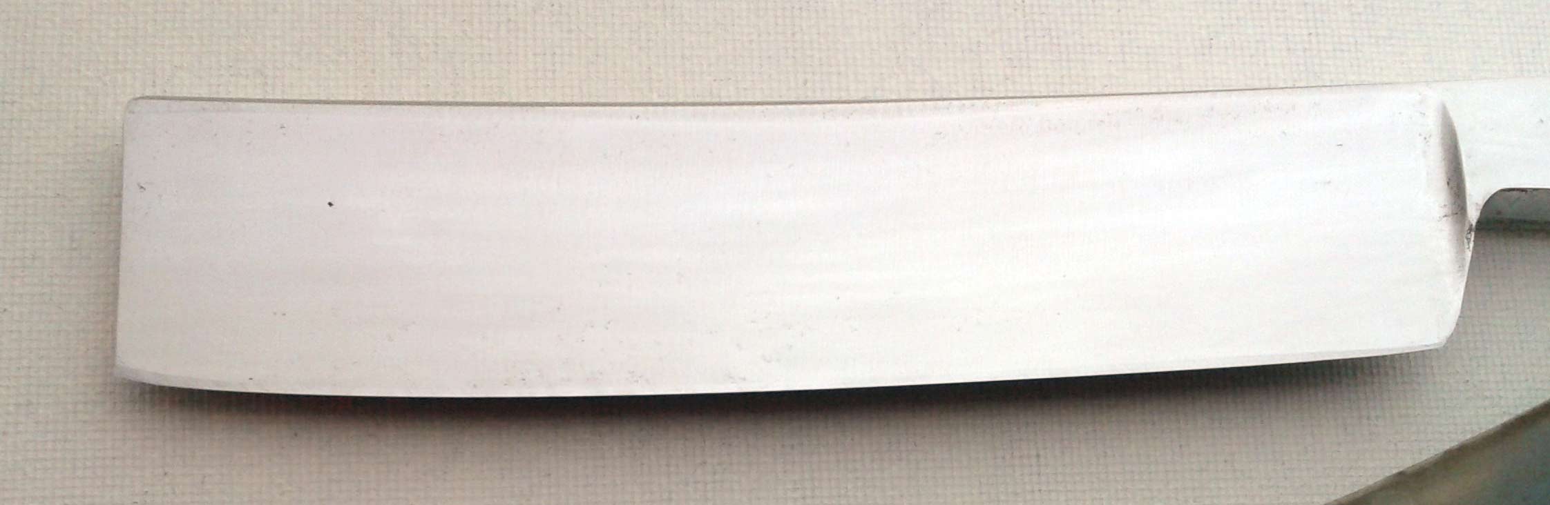 Spoiler Show Дальнейшая надпись читается плохо, но можно предположить что-то типа POND WORKS, SHEFFIELD. Надпись на полотне ROXO Сведения о производителе: http://britva.ru/forum/viewtopic.php?f= ... ers#p50963" onclick="window.open(this.href);return false; Ручка - натуральный рог в хорошем состоянии. Клинышек - металл. Свинец/олово клинышка окислилось и имеет неровности, однако свою функцию выполняет исправно. По-видимому, ручка, клинышек и пины родные. Заточена и полностью готова к бритью. Ширина полотна 16.5 мм, толщина в обушке 4.5 мм. Цена 70 евро, доставка включена.