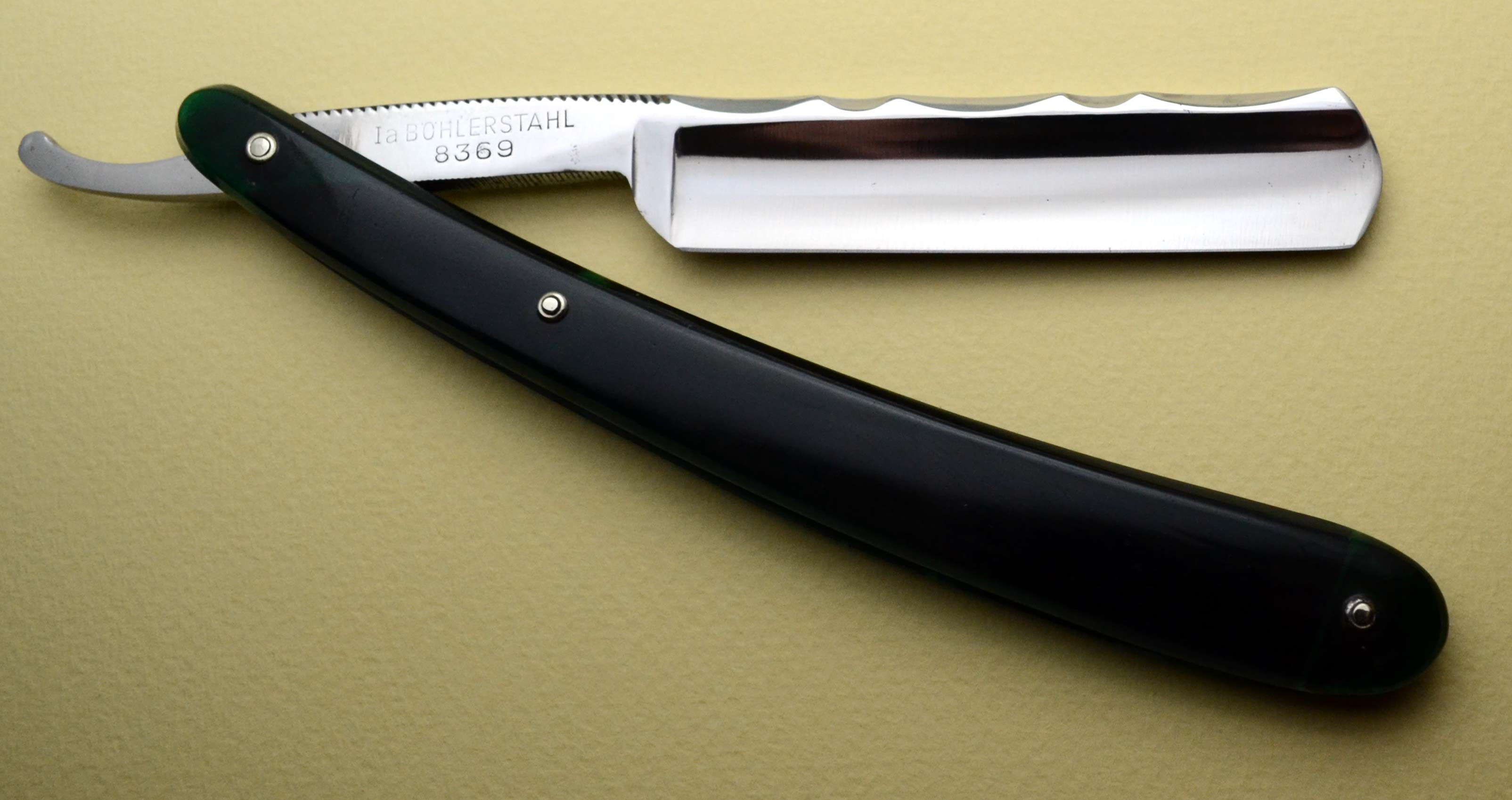 Ручка - целлулоид, в отличном состоянии, по-видимому, родная. Бритва точилась очень немного, близка к заводской геометрии. Заточена и полностью готова к бритью. Ширина полотна 20.5 мм, толщина в обушке 5.5 мм. Цена 60 евро, доставка включена.