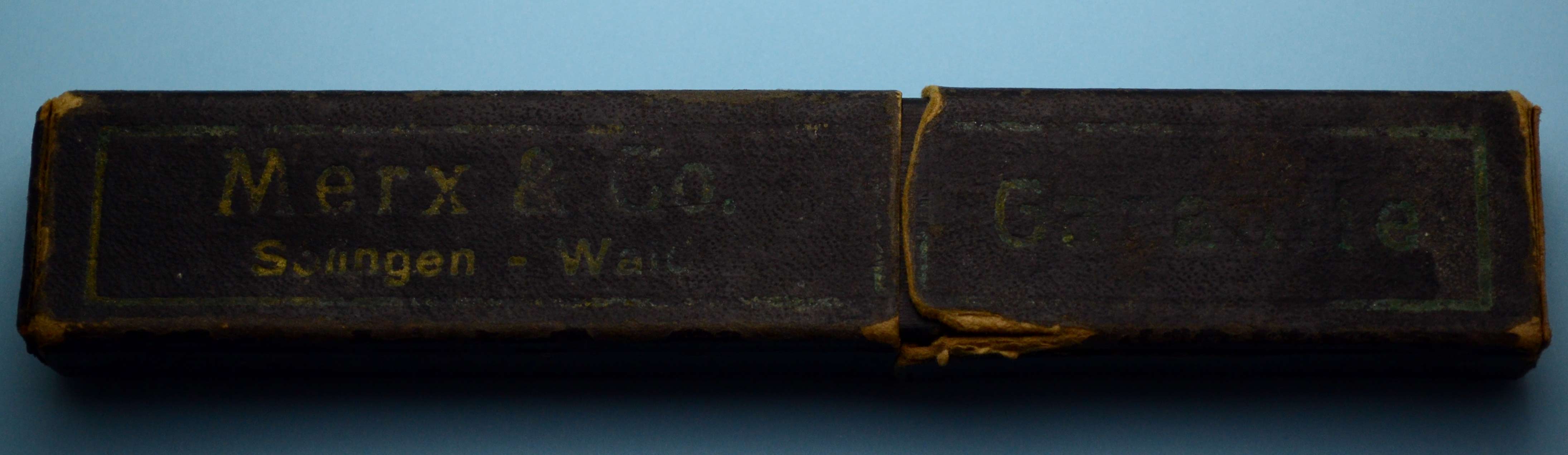Обратная сторона эрля: FINEST SILVER STEEL FORGED AND REAL HOLLOW GROUND IN GERMANY Сведения о стали: http://britva.ru/forum/viewtopic.php?t=3433" onclick="window.open(this.href);return false; От себя добавлю, что немецкие холлоу граунды из этой стали меня всегда радовали качеством бритья. Ручка - эбонит, в отличном состоянии, по-видимому, родная. Бритва была с заводской заточкой. Также на полотне была очень небольшая коррозия, поэтому шлифовка/полировка была минимальной. Можно говорить о то, что бритва очень близка к своему заводскому виду. Заточена и полностью готова к бритью. Ширина полотна 21 мм, толщина в обушке 5 мм. В комплекте родной футляр в отличном состоянии. Цена 70 евро, доставка включена.
