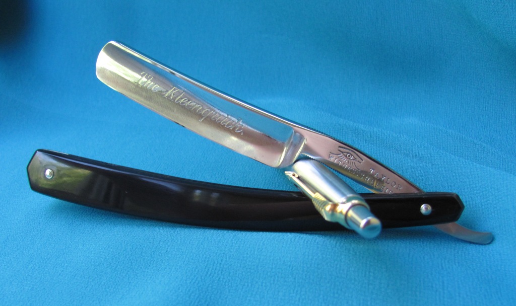 На полотне надпись "The Kleenquick" Бритва после реставрации, остались незначительные следы времени, что для её возраста простительно. Ручка рог, на не осевом пине была трещинка на ручке, она успешно заклеена, рог спасен. Ширина полотна 16 мм, обух 5 мм. Бритва заточена и готова к бритью. Цена : продана Taylor Show