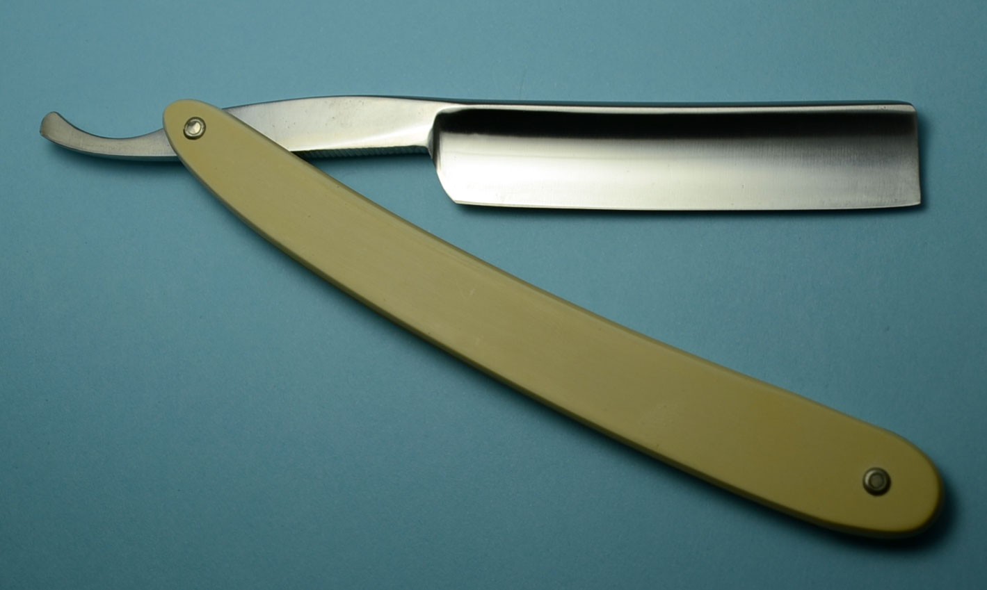 Ручка из кости, предположительно слон. На фото ручка получилась не очень похоже, в реале цвет более светлый и слегка желтоватый. Возле верхнего пина имеется трещина, заклеена цианакрилатом. При нормальном использовании проблем не будет.На фото ручка получилась не очень похоже, в реале цвет более светлый и только слегка желтый. Заточена и полностью готова к бритью. Ширина полотна 16 мм, толщина в обушке чуть меньше 4.5 мм.