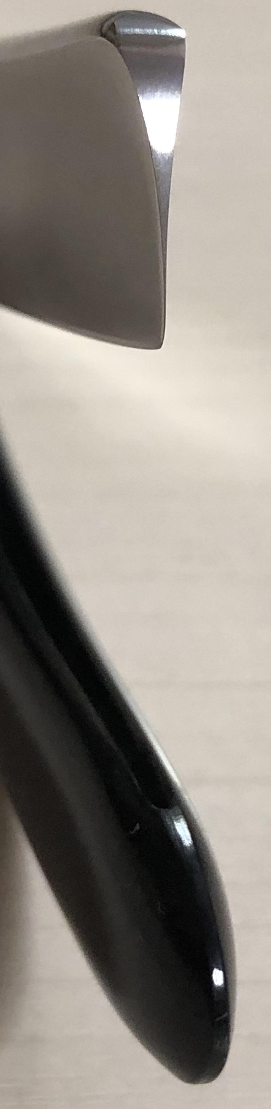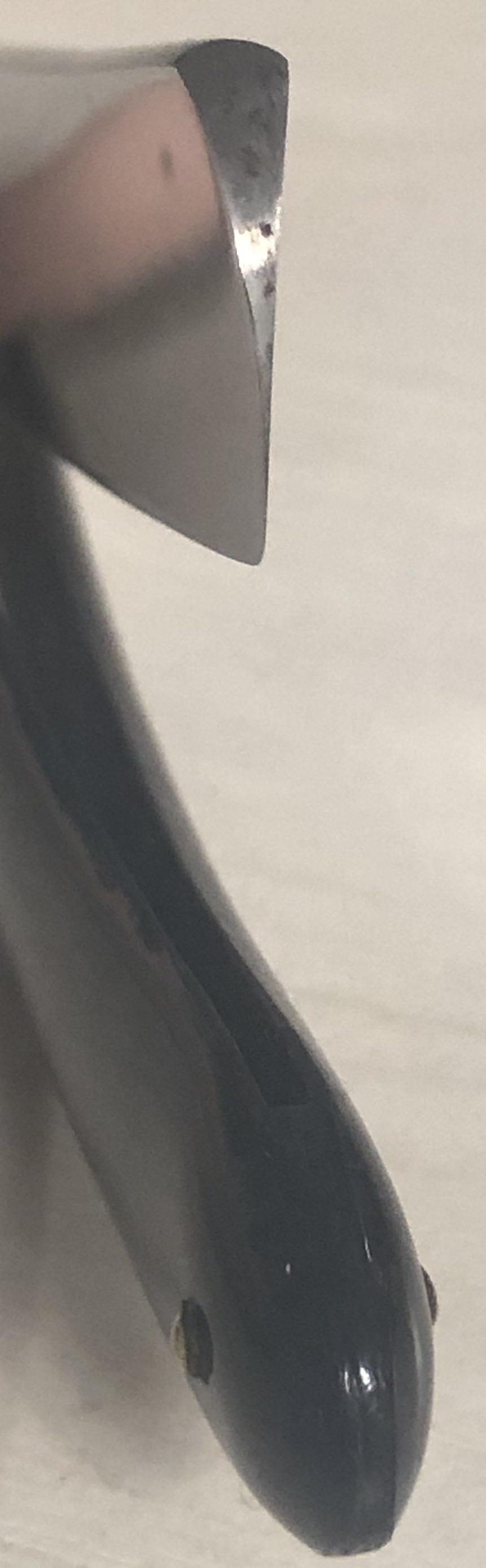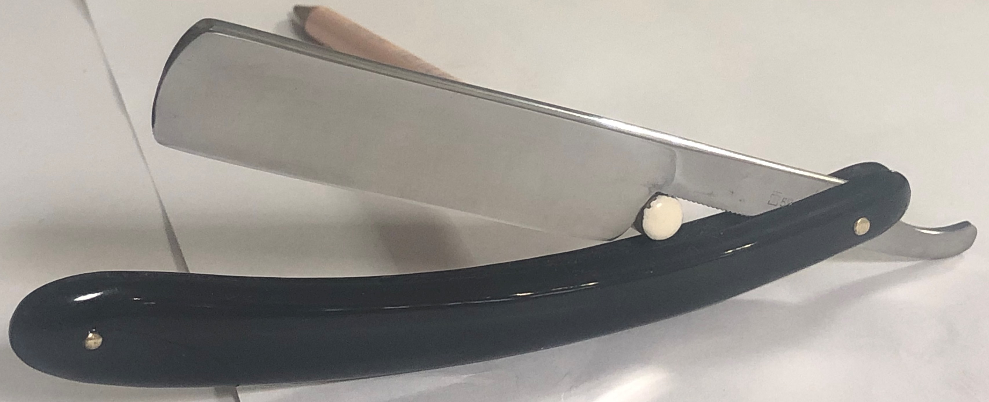 Ширина полотна-20 мм Толщина обушка-6.5 мм Углеродистая сталь. Форма лезвия-1/2 клин Примерно 50-60-е годы . Весьма приятная бритва во всех отношениях. Разобрал,почистил, отполировал и снова собрал, заменив пины на немецкие втулки.Снова не стал идти легким путем и шлифовал клинок на камнях, вручную.Долго, муторно, но получаешь удовольствие от процесса, заодно всегда можно проконтролировать то, что делаешь , чтобы не убрать лишнего и не перегреть с дуру металл..Ясное дело, что задачи не стояло получить идеальное зеркало, как это можно увидеть на множестве новодельных бритв:заплывшее от полироли зеркало. Тут скорее умеренный, легкий продольный сатин, хотя под другим углом ,если смотреть, то отражение очень хорошее.Приятный голубоватый оттенок от ручной шлифовки и полировки. Короче, достаточно красивая, практичная, удобная и недорогая бритва. Сталь не имеет визуальных дефектов, геометрия на уровне.Не пропустите рабочий инструмент за вменяемые деньги. Заточена и готова к бритью. Цена-6500 р с доставкой.ПРОДАН Внимание! Важная информация! Spoiler Show