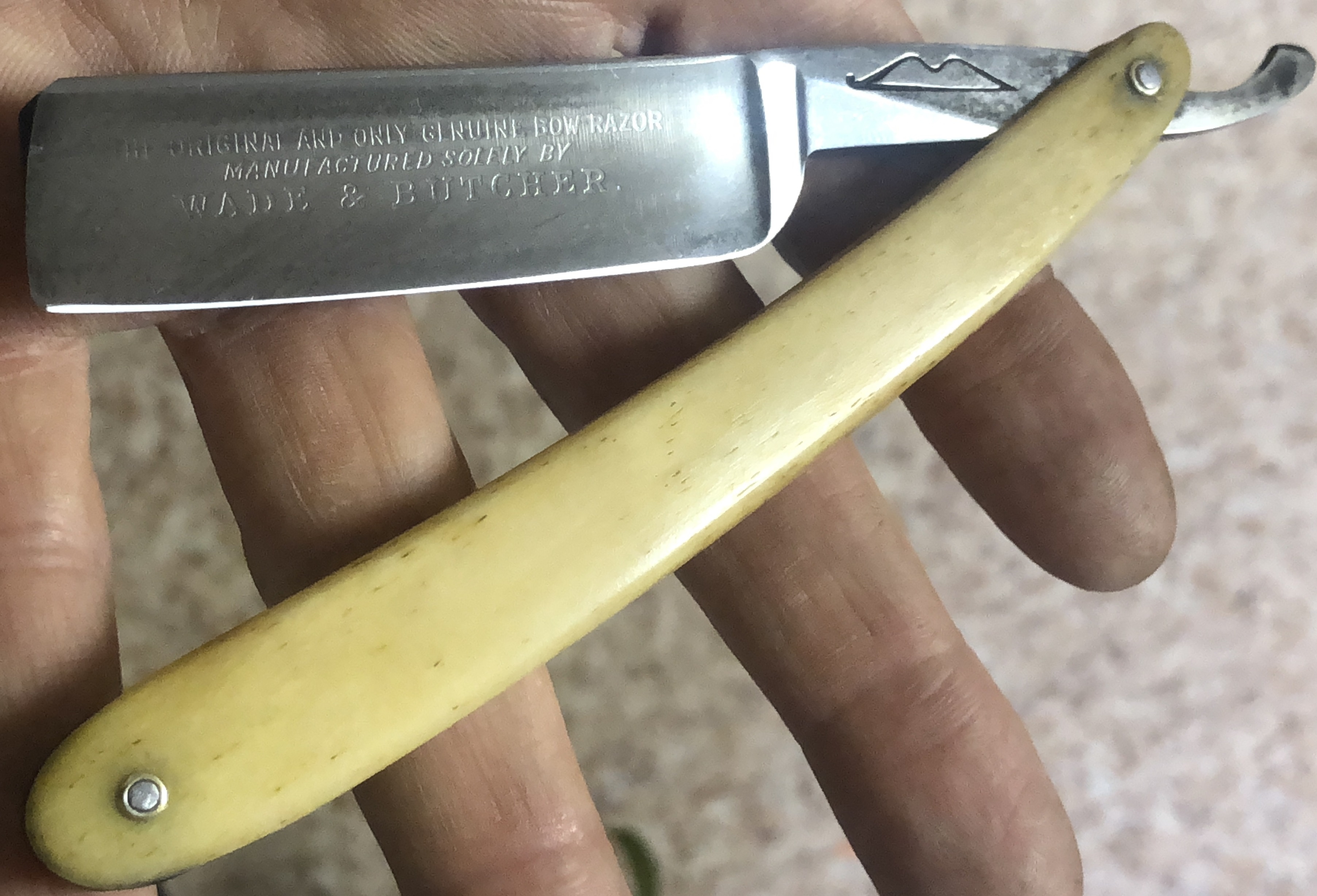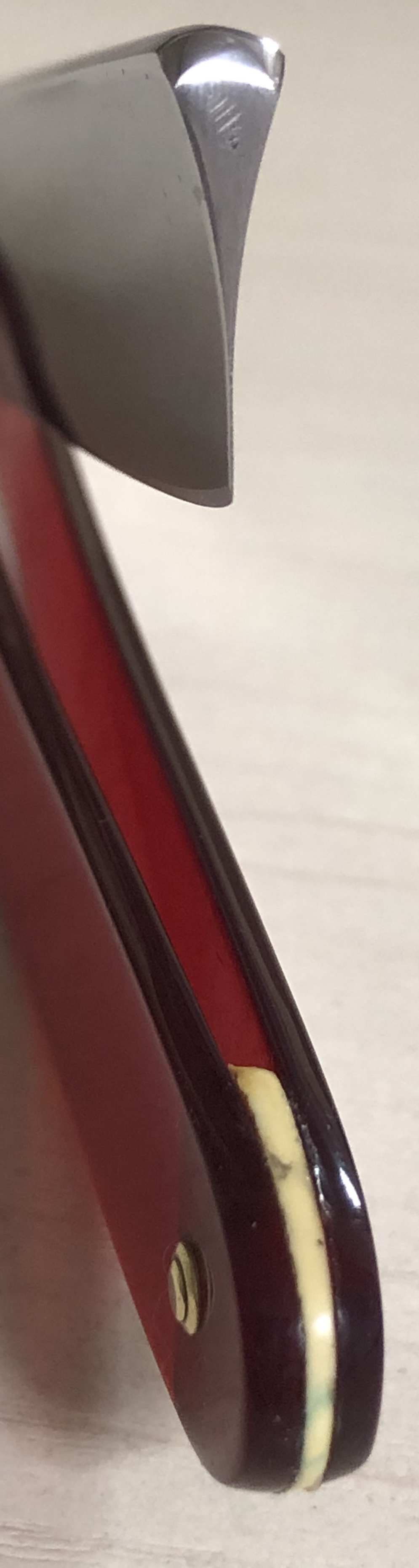 Бритва в очень хорошем состоянии для своих лет. Разобрал, немного освежил металл и снова собрал.Следов активного пользования и уточки клинка не замечено. Родную оправу не стал менять из за небольшой трещинки, которую намертво проклеил и зашлифовал.Кромочка равномерна по всей длине. Сталь чистая от разного рода видимых дефектов. Очень удобная и приятная бритва, во всех отношениях. Будет идеальным вариантом для новичка и просто в коллекцию, так как думаю что бритва достаточно редкая. Никогда ничего подобного не видел.Заточена и готова к бритью.
