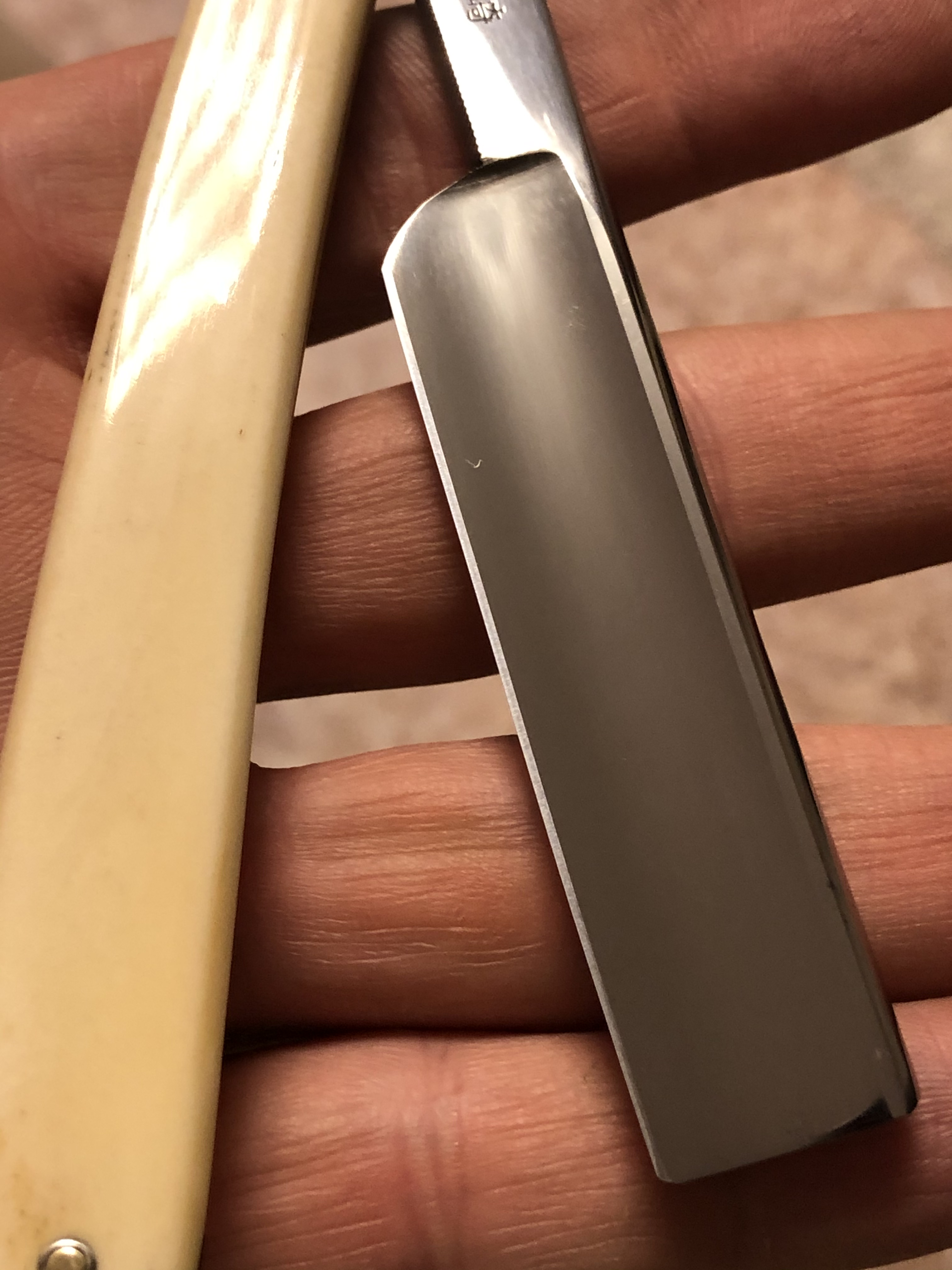 Не стал стачивать много "мяса", чтобы убрать все изъяны и рытвинки металла, а просто почистил и заточил.В целом клиночек чистый, за исключением небольшого количества у обушка.Кромочка равномерна по всей длине.Сталь очень неплохая в плане заточки, впрочем как и большинство французских бритв этого периода.Роговая оправа в очень хорошем состоянии, практически без отгрызанных мест. Массивная , тяжёлая бритва. Заточена и готова к бритью.
