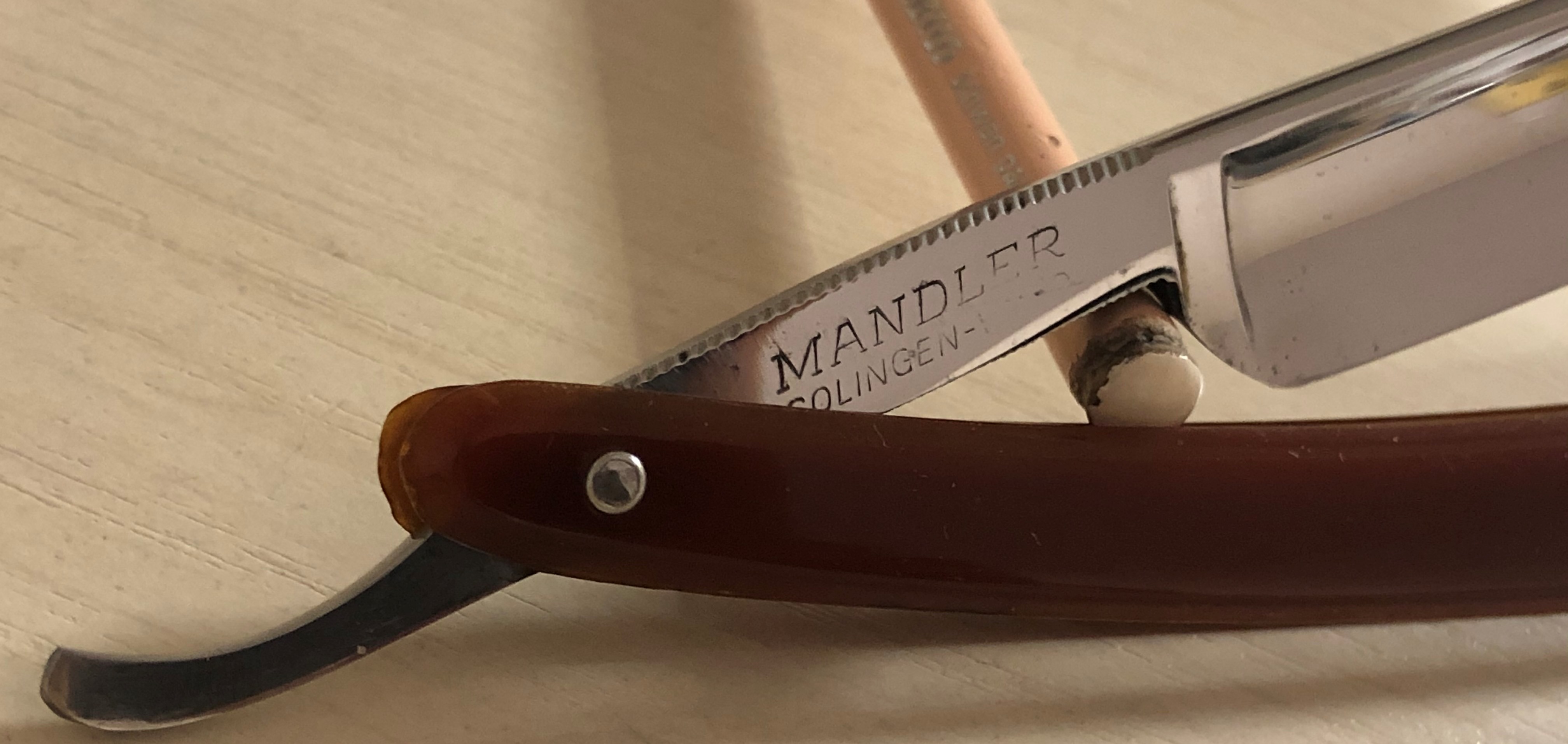 Бритву разобрал, почистил и снова собрал, добавив внутренние шайбы и сохранив оригинальные пины.Идеальная геометрия клинка:кромочка равномерна по всей длине.Очень неплохая сталь с точки зрения заточки.Думаю, что и бритье не разочарует. Родная оправа также в очень хорошем состоянии. Бритва среднего размера,без признаков активного пользования, главное, недорогая, будет отличным вариантом для новичка и просто в коллекцию.Заточена и готова к бою.