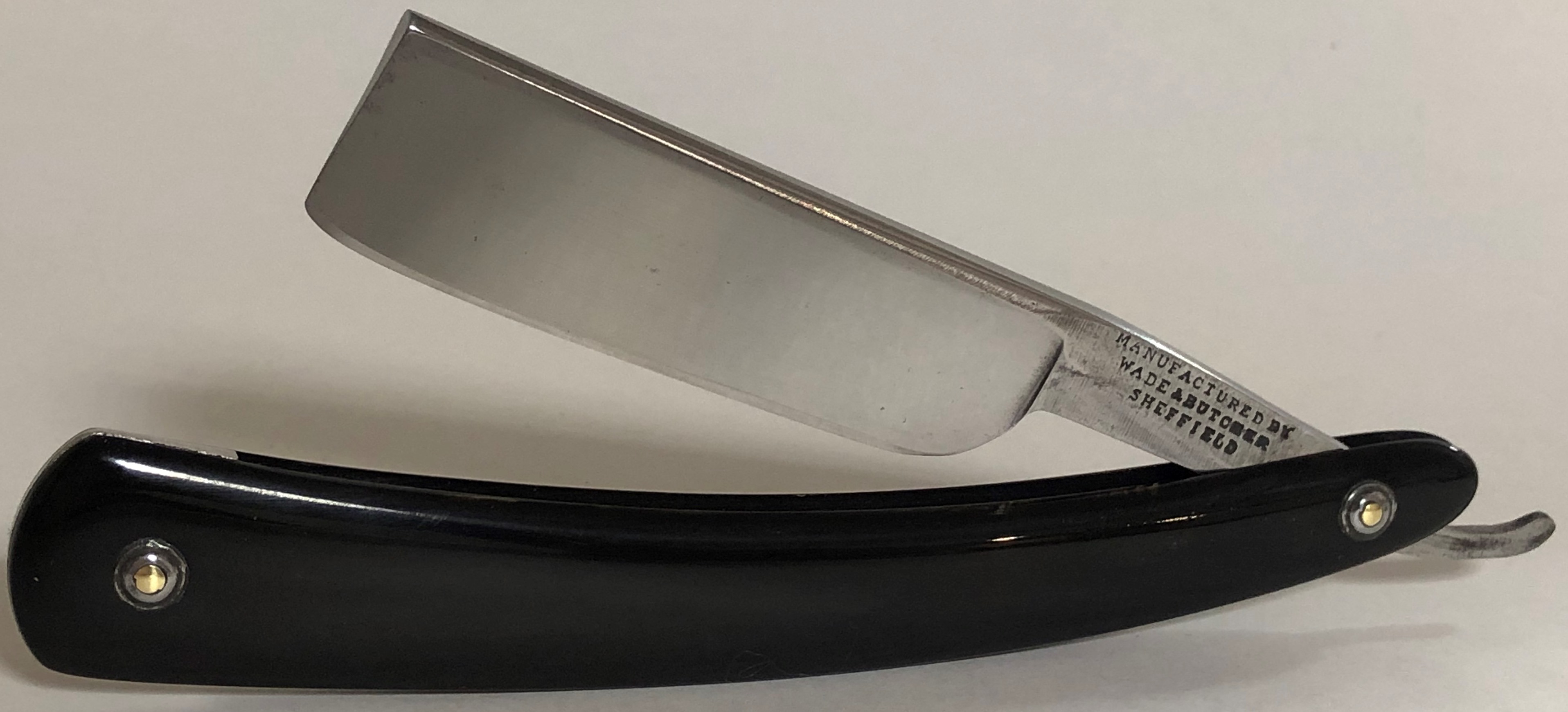 Итак, первый"Мясник" на ваш суд.. WADE&BUTCHER-знаменитый THE SELEBRATED HOLLOY GROUND RAZOR Ширина полотна-23мм или 7/8 Толщина обушка-7 мм Форма лезвия-1/2 клин Углеродистая сталь. Бритва изготовлена до 1891 года, наверно ближе к середине века. Информации по этому легендарному бренду достаточно много, так что можно самостоятельно все найти. Бритва в прекрасном состоянии для своих преклонных лет.Разобрал.Клинок имеет оригинальную ширину.Так как полотно изначально не требовало каких то радикальных работ , в виде регринда и большого снятия металла, то я лишь немного освежил клинок тонким абразивом и все, оставив немного патины, для красоты.Немного больше патины оставил в районе эрля.(все таки не дают мне покоя японские кованые бритвы ручной работы, с коваными и воронеными эрлями). Клинок не имеет рытвин, коррозии или других дефектов металла.Оправа из медового натурального рога, также находится в прекрасном состоянии, без трещин и расслоений.Редкая вещь. Родные пины в комплекте.А куда же без них, чтобы все по фэн шую было?Родная коробочка в удовлетворительном состоянии. Ну тут уж извините.Не каждый картон способен дожить более 150 лет... Тяжелая, брутальная и редкая англичанка будет до конца заточена и доведена до комфортного бритья. Цена-28500 р с доставкой ПРОДАН Spoiler Show