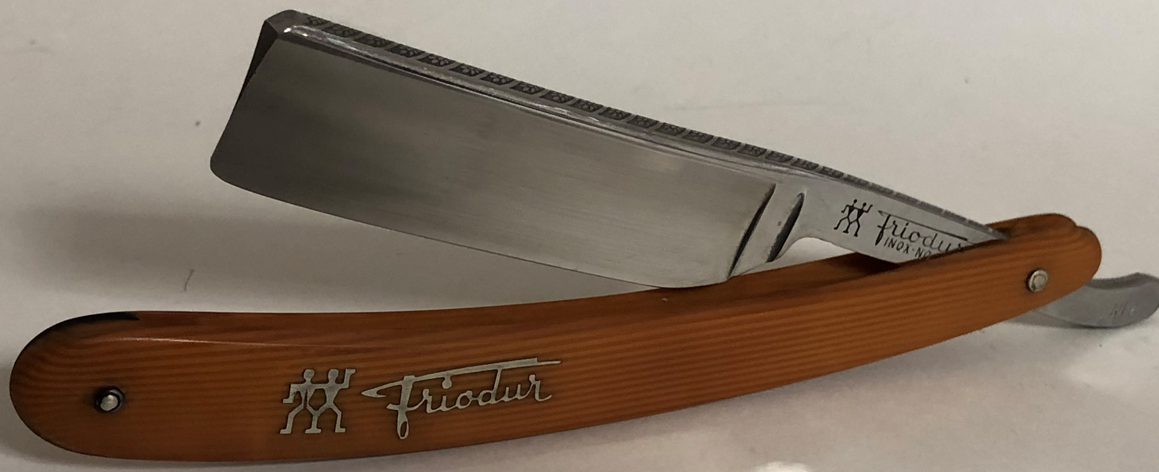 Середина прошлого века производство.Самая крупная и мощная модель..Идеальное состояние, без следов пользования. По всей видимости в пользовании не была.Перебрал бритву, заменив пины на немецкие дву-цветные втулки, с добавлением внутренних шайб.Освежил клинок от патины, на самых тонких абразивах и умеренно отполировал.В районе эрля убрал остатки ржавчины.С обратной стороны штамп был изначально плохо пробит, а не результат чистки.Сталь и кромочка чистые от разного рода дефектов. Идеальная геометрия клинка:кромочка равномерна по всей длине и еле заметна. Прекрасный и редкий экземпляр для любой коллекции! Заточена и готова к бритью.