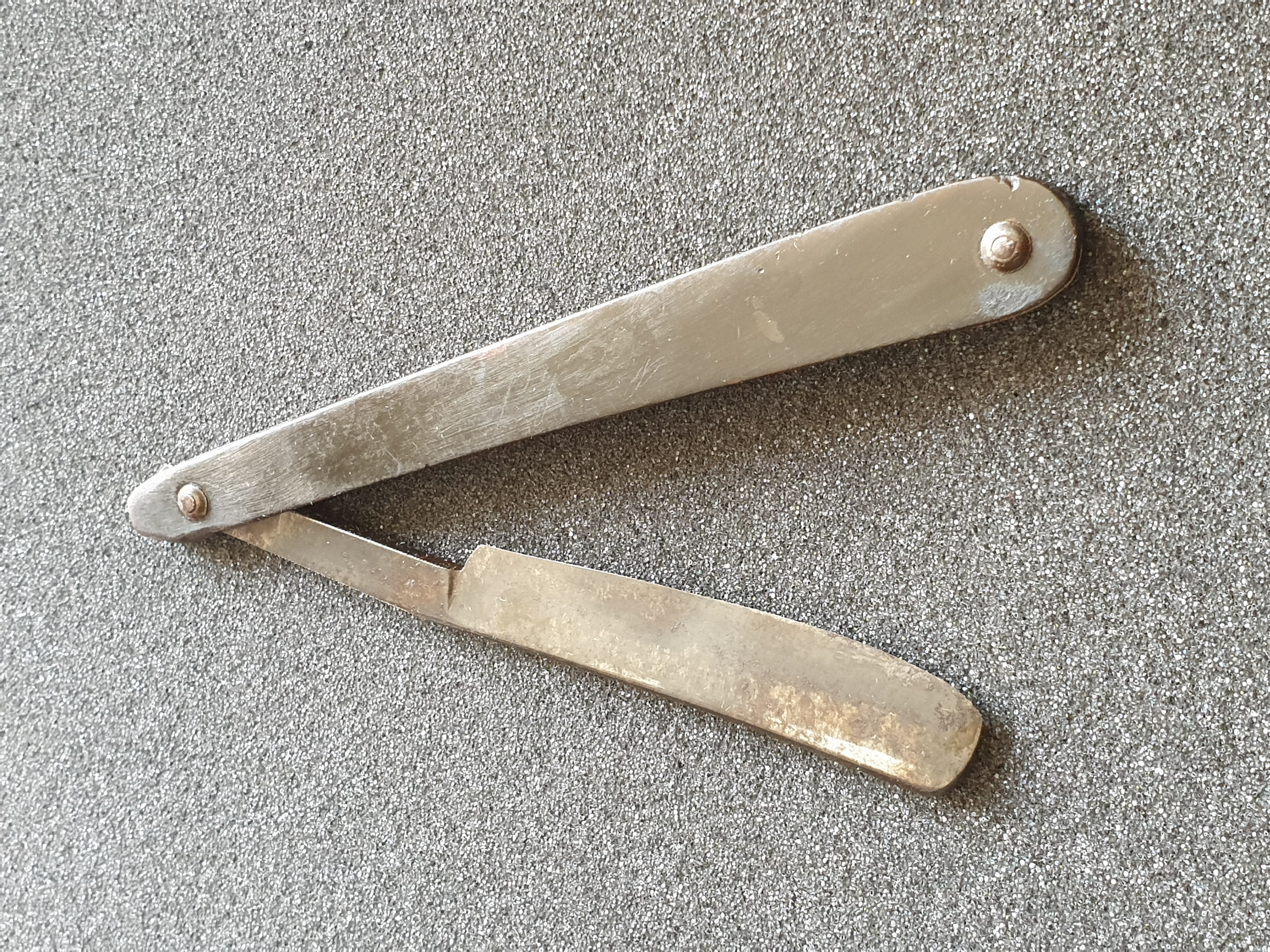 Продаётся от S&T67. Винтажный французский бесхвостый клин, под восстановление. От клейма остались полунамеки на пару букв. Ширина клинка 16мм. Ручка из рога, в весьма хорошем сохране, крепкая, пины - железо, с внешними шайбами типа "бычий глаз". Мелкая насечка на эрле с обеих сторон. Все родное, бритва не разбиралась, клинок паркуется в ручку по центру, без перекосов.