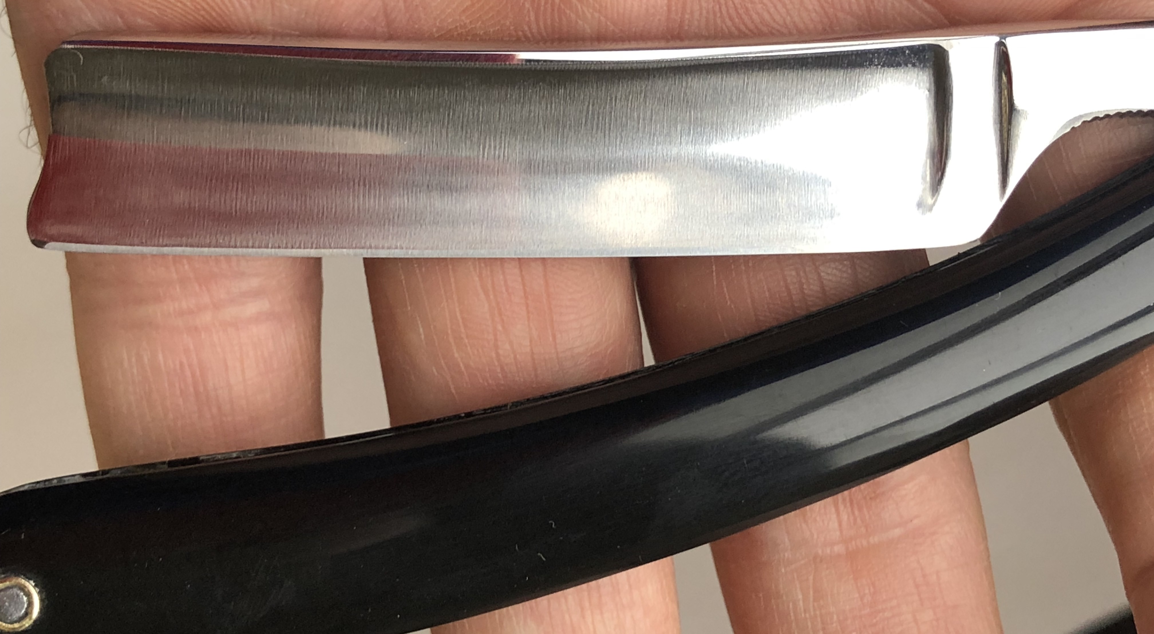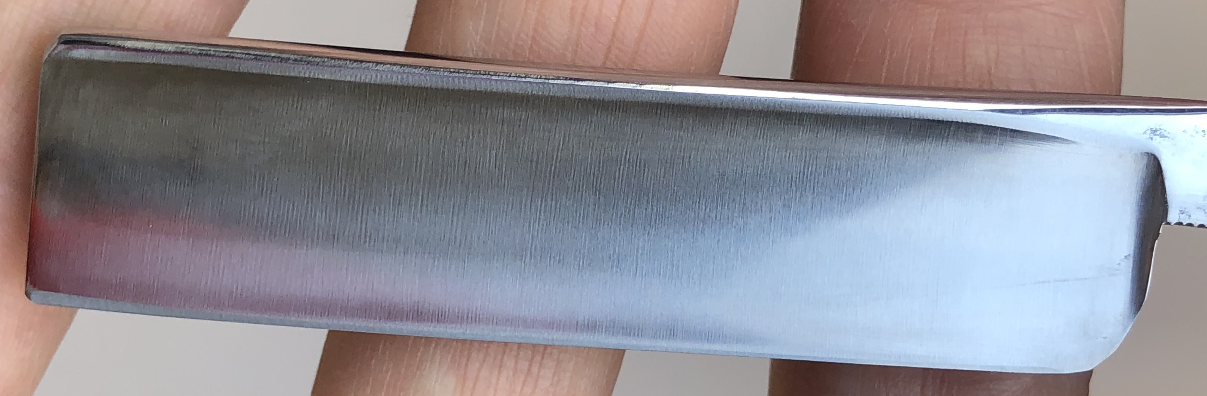 Бритва в состоянии приближенном к идеальному.Не разбиралась и не ремонтировалась. Единственно что, убрал на самых тонких абразивах пятна от остатков воды на клинке.Сформировал "типа-оригинальный" гринд полотна и умеренно отполировал.Сталь чистая от дефектов.Кромочка почти идеально ровная по всей длине. Родная коробочка в хорошем состоянии.