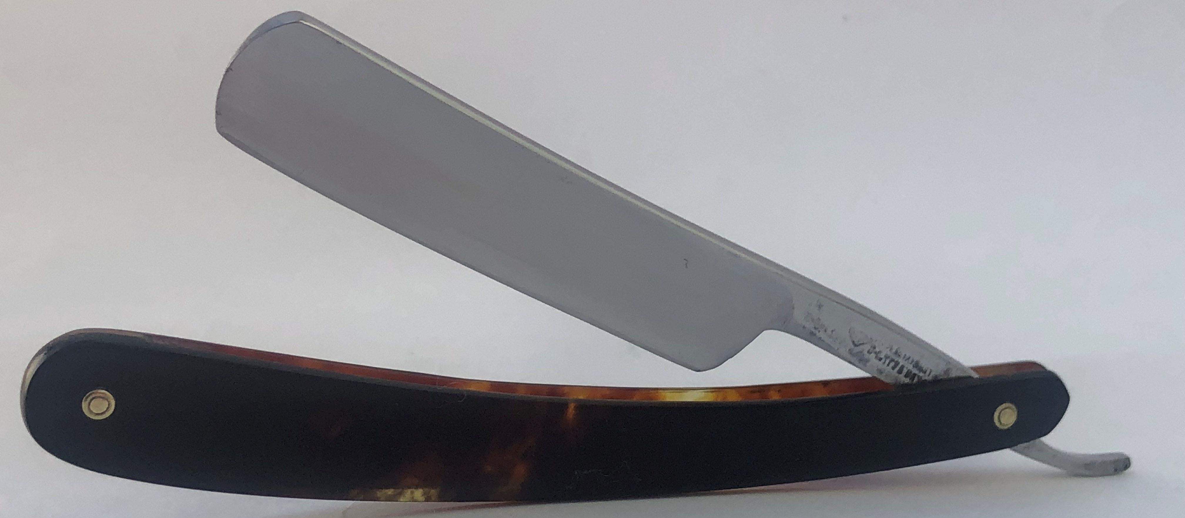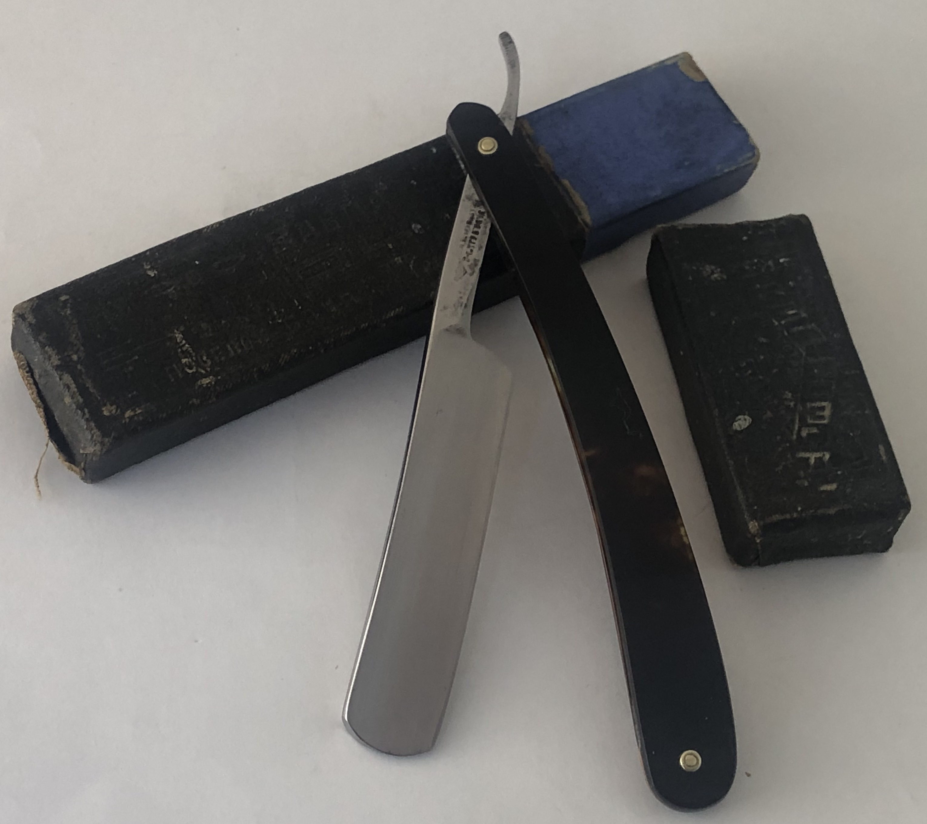 Изначально бритва не имела следов пользования. Разобрал, почистил немного полотно, с сохранением эффектной патины на эрле.Сталь клинка чистая, без видимых дефектов.Красивая оригинальная оправа,"под черепаху".Родная коробочка в комплекте! Бритва заточена и готова к бритью.