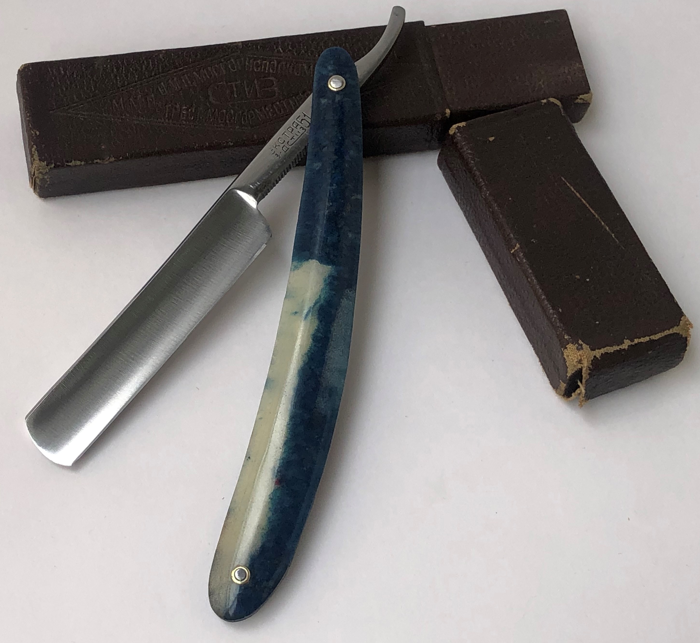 Клинок в очень хорошем состоянии.Немного был почищен и умеренно отполирован. Красивая, эффектная ручка из "фирменного"материала Тараса Телегина.Старинный кожаный кейс.Бритва заточена и готова к бритью.