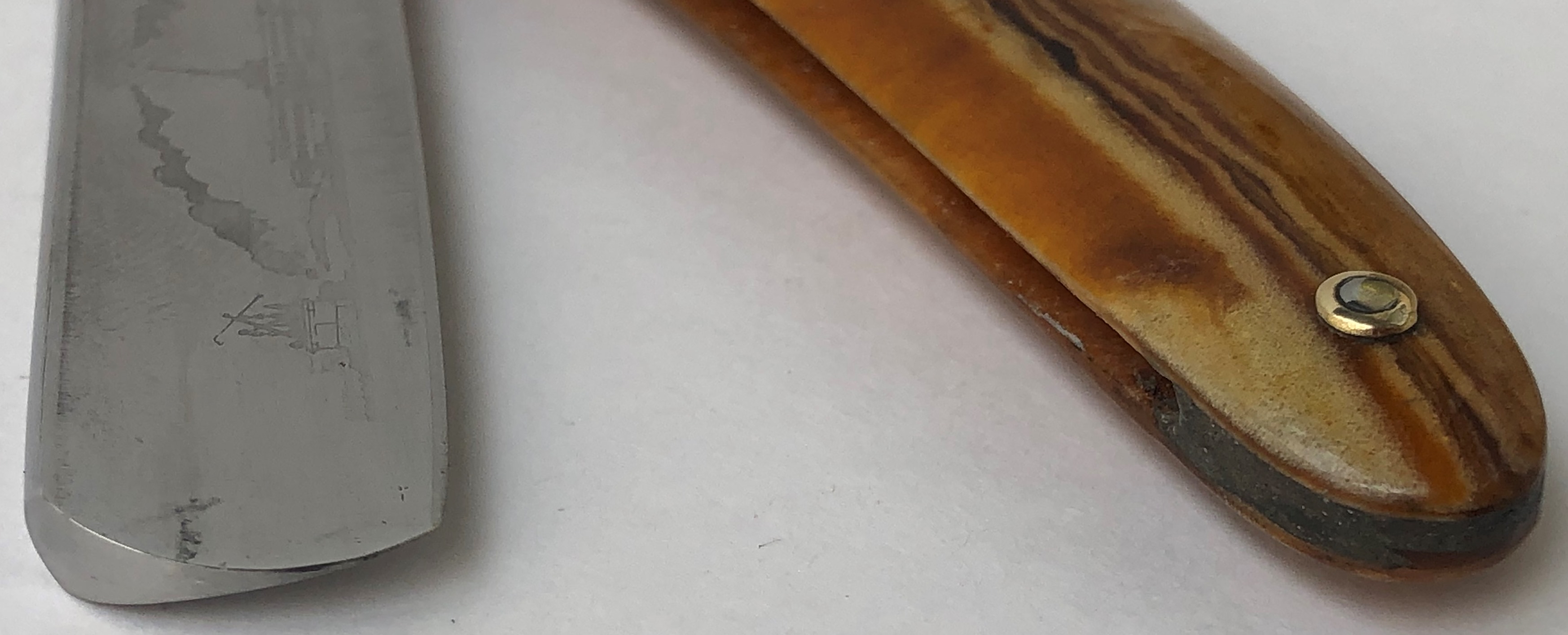 Бритва в хорошем состоянии.Была разобрана и приведена в порядок. На задней стороне полотна были удалены царапины от прежней заточки и умеренно отполирована.Лицевая сторона имеет царапинки от неправильной заточки, поэтому не стал там особо ничего трогать,чтобы не повредить картинку, а только немного протер вручную тряпочкой с полиролью.На эрле оставил немного красивой патины.Идеальная геометрия клинка:кромочка равномерна по всей длине.В общем и целом очень приятная и совершенно недорогая бритва. Стизовская коробочка достаточно ветхая, но чем богаты, что называется..
