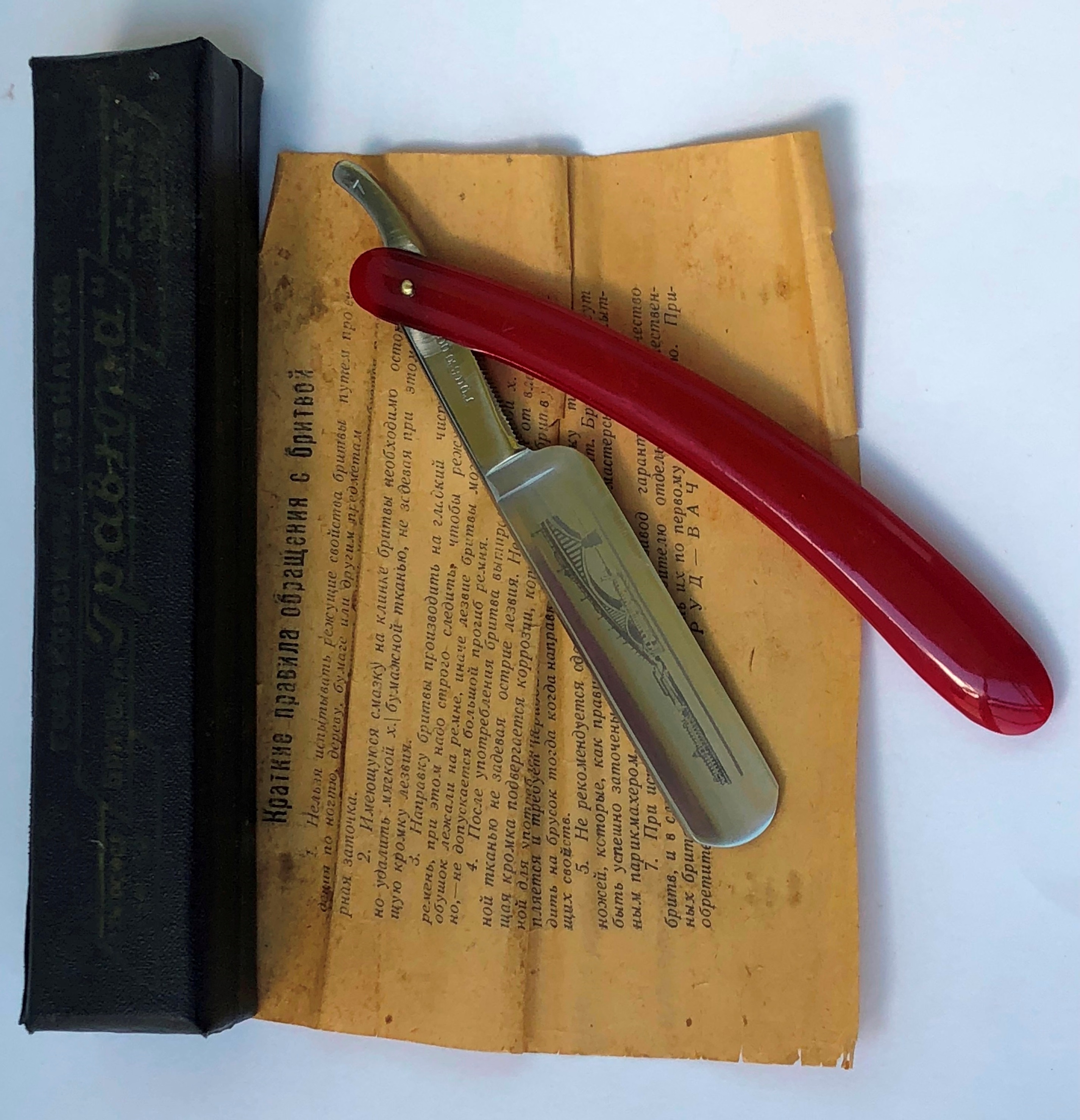 Бритва в исключительном непользованном состоянии. Не разбиралась и не ремонтировалась.Заводская заточка и полировка полотна. Идеальная геометрия клинка:кромочка равномерна по всей длине.Имеется след от электро-химической заводской заточки.Ручка "пролетарского"цвета.Перед отправкой бритва будет доведена до комфортного бритья.Оригинальная коробочка и редкая инструкция в комплекте! Не пропустите редчайшую вещь длс своей коллекции.