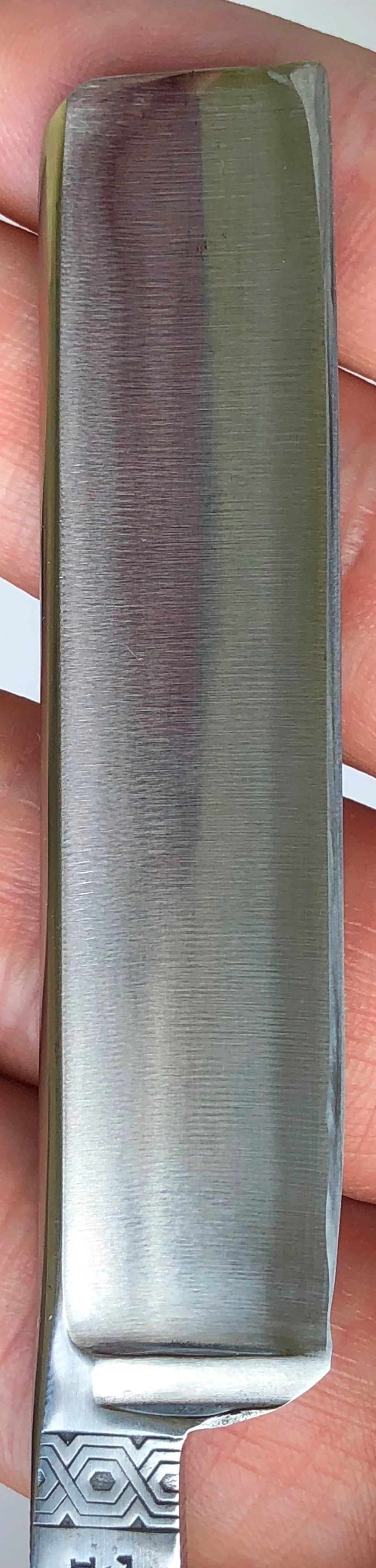 Клинок в очень хорошем и малопользованном состоянии.Бритва была разобрана, освежено полотно от патины, с сохранением небольшого элемента патины на эрле, дабы придать более естественный вид и некий налет старины на металл, в соответствии с возрастом.Ручка была заново отполирована, оригинальные пины сохранены и заново установлены. с добавлением внутренних шайб.Идеальная геометрия клинка:кромочка равномерна по всей длине.Очень неплохой и недорогой вариант для всех, кому интересно бритье клинковой бритвой. Заточена и готова к бритью.