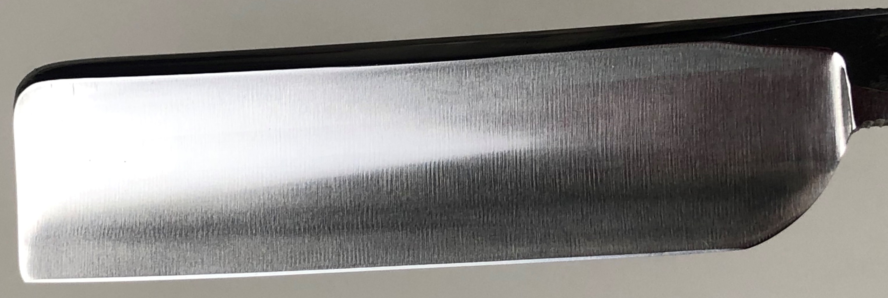 Бритва с минимальными следами пользования.По всей видимости была заточена однажды, а потом просто доводилась на финишниках.Сторона "ура" имеет прекрасную многолетнюю патину.Сторона "омоте" оригинальный грубый гринд.Идеальная геометрия изготовления. Кромочка на "ура" равномерная и еле заметна.На "омоте" шире, но также равномерна по всей длине.Сама сталь Тамахагане каким то магическим образом привлекает всех любителей японской Бритвы и заставляет искать по всему миру то, что сейчас еще где то осталось от этой самой известной семьи.С бритвой ничего не делал, а только тряпочкой протер, как бы это смешно не звучало для многих посвящённых товарищей..