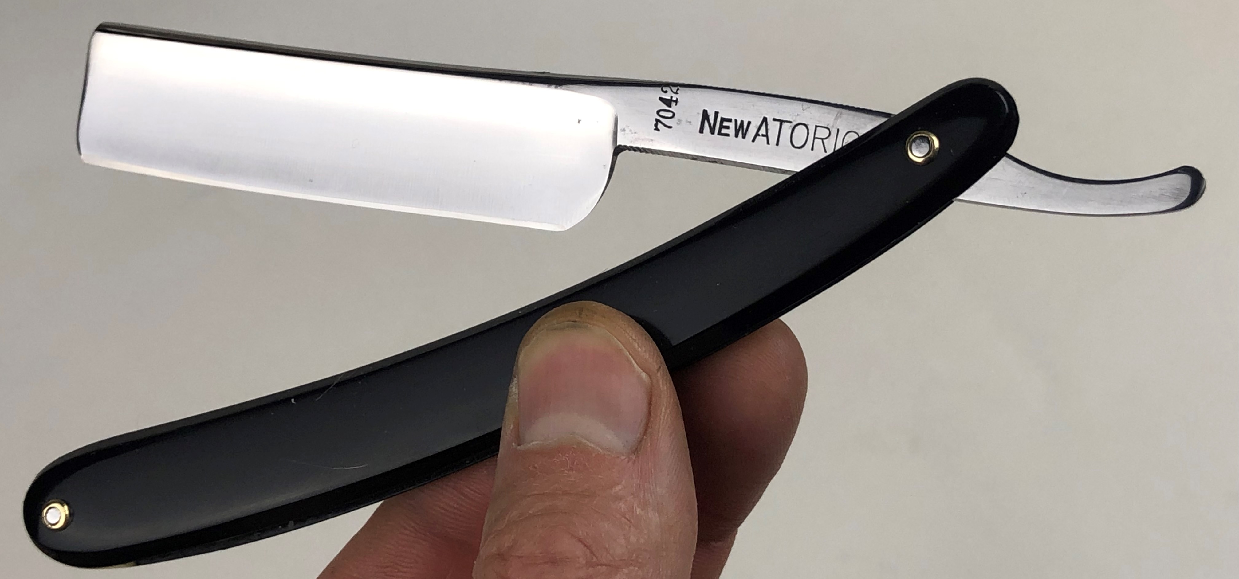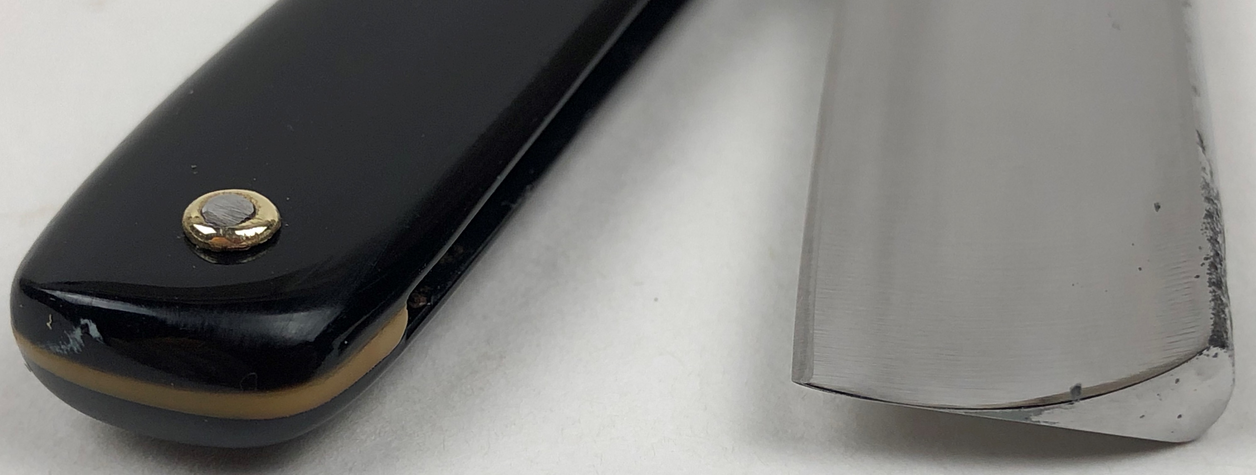 Бритва в очень хорошем состоянии. Немного откорректировал утОчку обушка и умеренно отполировал клинок.Поменял пины на двух-цветные втулки и добавил внутренние шайбы.Идеальная геометрия:кромка ровненькая по всей длине полотна.Тяжёлая.Заточена и готова к бритью.