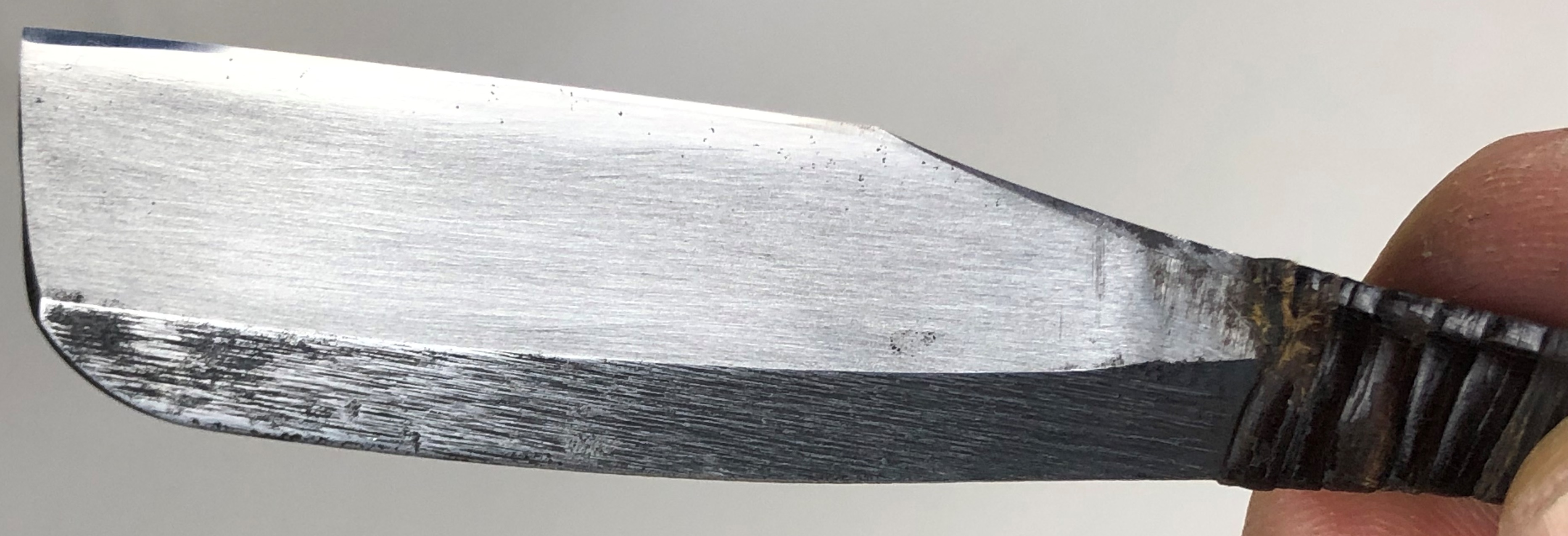 По всей видимости бритва не была в пользовании.Тяжёлый укороченный клинок. Следов от заточных камней на обушке нет и не было.Разобрал бритву, чтобы установить внутренние шайбы, так как без них ручка сильно царапала клинок.Заодно убрал остатки окисления и патины, ну и прошелся косметически по полотну, для порядка. Умеренная полировка.Оригинальные пины удалось заново поставить. Сталь чистая, без дефектов. Кромочка ровненькая по всей длине.Бритва сейчас в состоянии новой.Перед отправкой будет заточена и подготовлена к бритью.