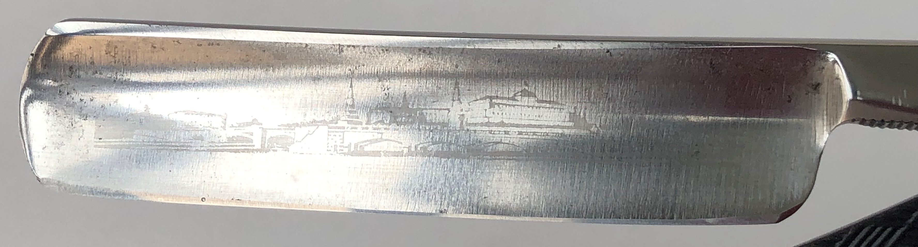 Бритва в хорошем состоянии.Довольно редкое исполнение "столичной", с изображением Кремля.Никогда ничего подобного ранее не видел. В другой ситуации просто почистил бы полотно с обеих сторон , с целью убрать остатки окисления, но тут из за гравировки решил оставить.Бритва была разобрана, убраны "следы времени" на эрле и обратной стороне клинка. Добавлены внутренние шайбы.Родная сломанная оправа была заменена на более раннюю, стизовскую, 1940-х годов.Кромочка почти идеальна. Заточена и готова к бритью.