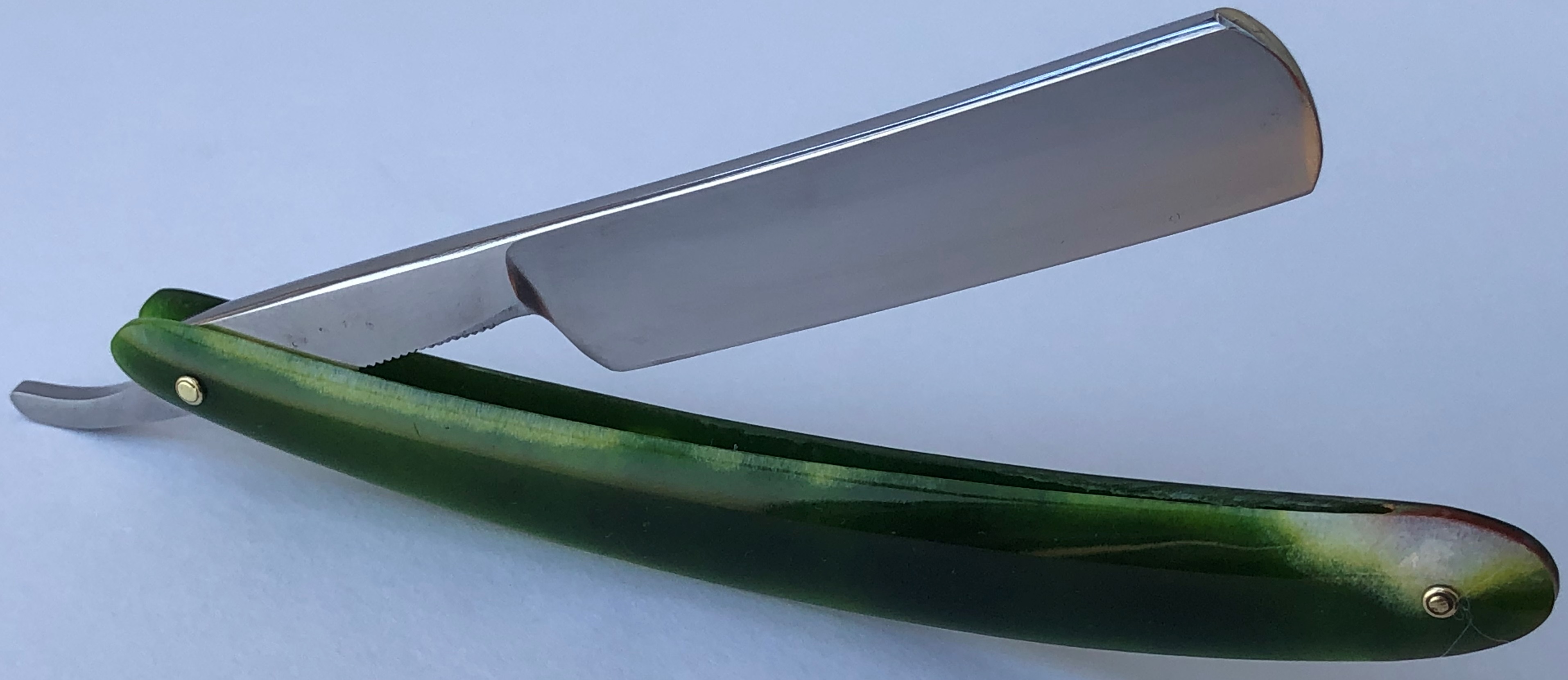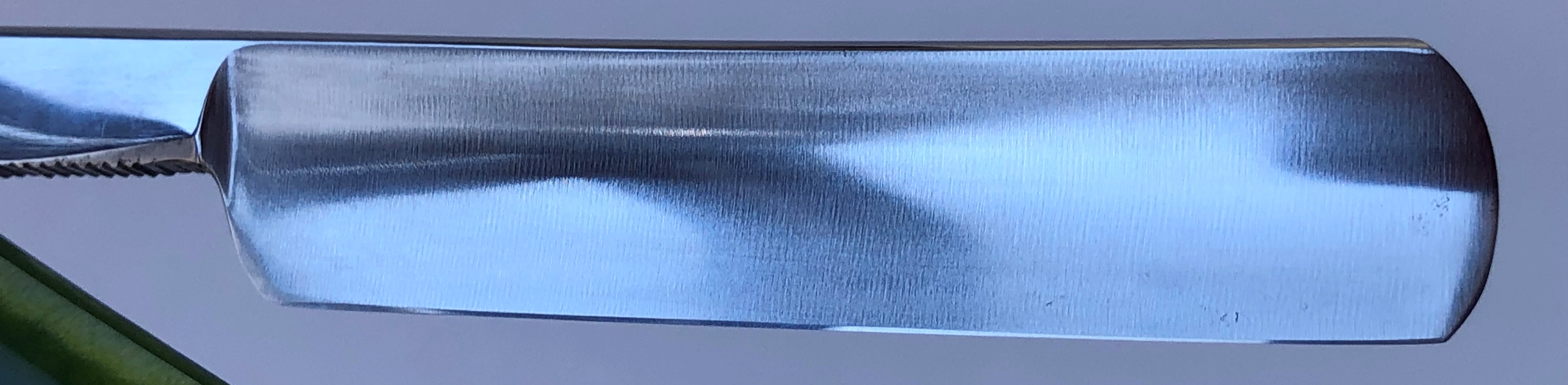 Бритва в идеальном и непользованном состоянии. Была разобрана для удаления окисления в районе осевого пина, а также немного освежил само полотно от небольшого налёта патины.Косметическая, минимальная шлифовка и умеренная полировка.Идеальная геометрия клинка:кромочка равномерна по всей длине.Отличная "звонкая" сталь.Мощная и надёжная трёх-пиновая оправа.Состояние новой. Бритва заточена и готова к бритью.