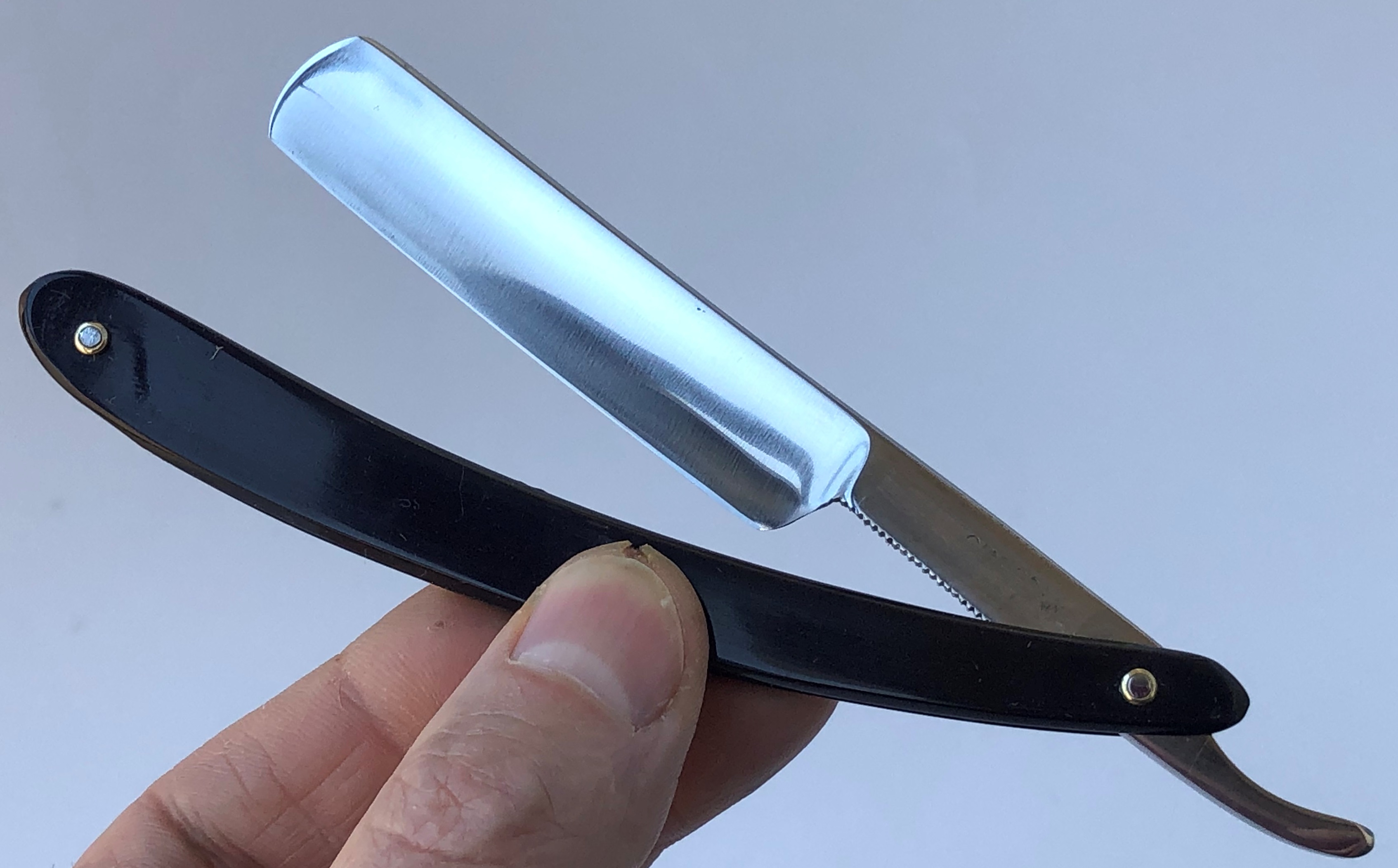 Бритва в очень хорошем состоянии, без активных следов пользования. Была разобрана, приведена в порядок и снова собрана, с заменой пинов и добавлением внутренних шайб.Сталь чистая, без видимых дефектов.Достаточно хорошая геометрия клинка.Заточена и готова к бритью.